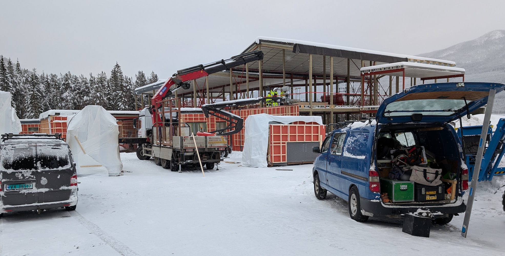 Det er MEBYR som har fått oppdraget med å bygge barnehagen, men det er Turhus Maskin som har ansvaret for gravearbeidet. 10.10.2025 er dei kome så langt at Mebyr kan starta opp. 16.10.2025 er dei kome godt i gang med det innleiande grunnarbeidet. 17.11.2025 er påstøpen ferdig og den store krana er komen. 19.11.2025 Montering av stålkonstruksjonen er i rute. 04.12.2025 er mykje av stålkonstruksjonen montert og takelementa finn plassen sin. 17. desember 2025 kom siste del av taket på plass og den store krana er ferdig med oppdraget. Så er det veggelementa som finn plassen sin. Juleferien er over og eit nytt arbeidslag er på plass. 21. januar 2026 såg det slik ut.