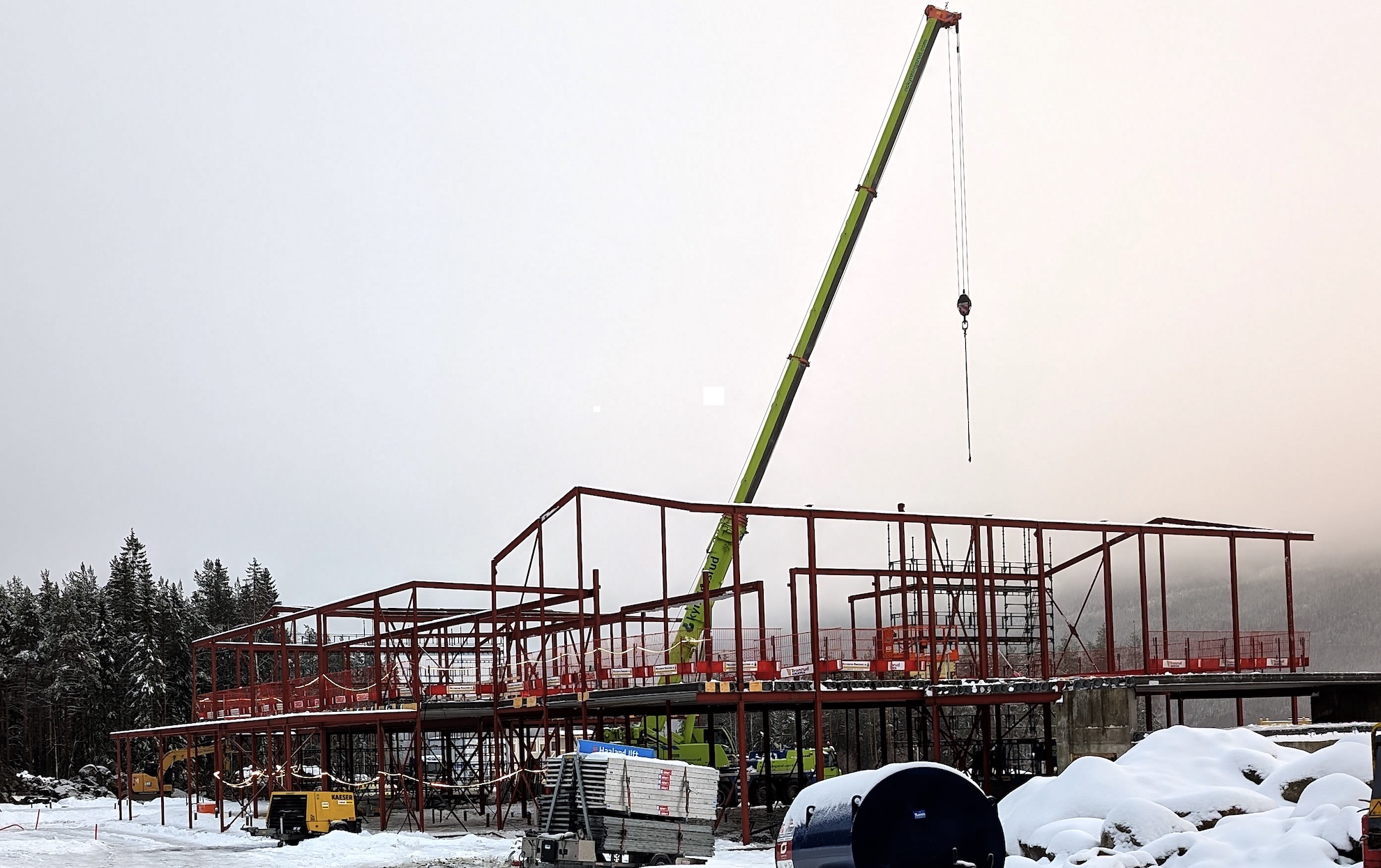 03. november 2025(B)(B)(B). Isoporen er på plass og radonsperren trekkes: 06. november 2025(B). Armeringsmattene legges: 09. november 2025(B)(B). Avslutter med påstøp: 13. november 2025(B)(B) Brakkeleiren treng tilkopling til det kommunale vatn- og avløpsnettet(B). Ei (lastebilkran) har vore her nokre dagar. I dag 17. november 2025 er "(nordic crane)" på (plass) og stålkonstruksjonen vert montert: 19.11.2025(B). 23.11.2025(B). 28.11.2025(B). Tid for å få betongdekket på plass: 02.12.2025(B). 04.12.2025(B)(B). 13.12.2025(B)