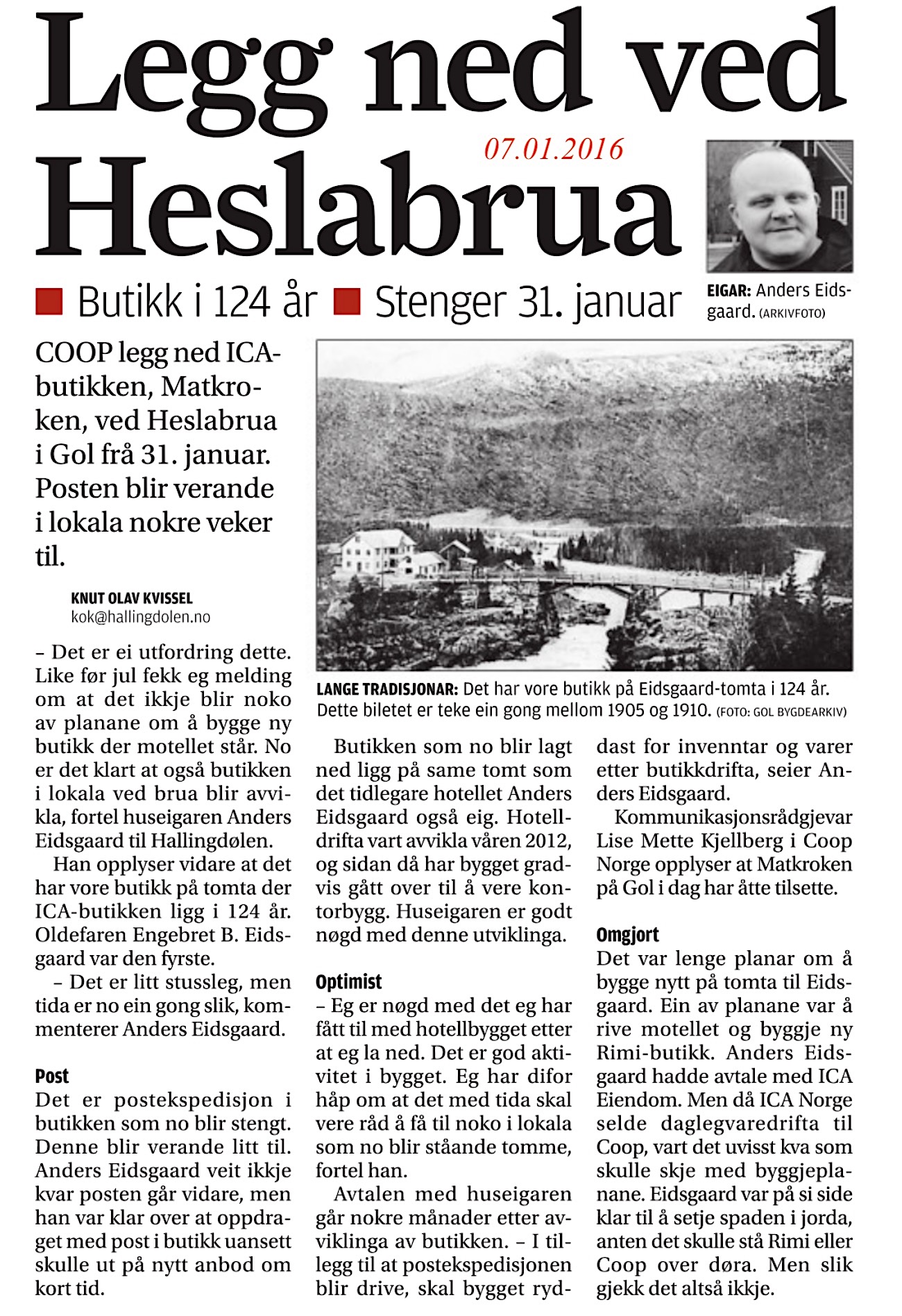 Hemsedalsvegen 2, 14/29 Bruslet vart bygd i 1890. I 1890 starta Arne Pålson Halsteinsgård(L) frå Hol opp som kjøpmann på nordsida av Heslabrua. Dette var den første av dei nye landhandlarane i Gol(B). Etter Arne tok sønene Pål og Petter over drifta av krambua medan Aslak tok seg av garden(B). Sven Ivarson Halsteinsgård overtok Bruslet i 1971. Han var landhandlar til 1982(B). Sonen Stein Morten er i dag eigar av Hemsedalsvegen 2.(B).