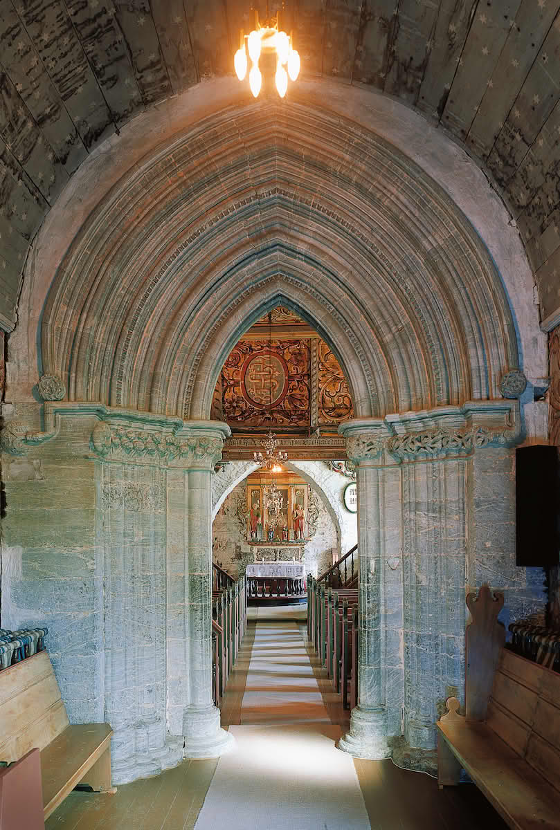 Møtet med klebersteinsportalen i den gamle steinkyrkja gjer oss nesten mållause. Nidarosdomen har   slike  portalar, i større format sjølvsagt, og det er ikkje så rart. Men ei landsens kyrkje - ei slik   openberring?