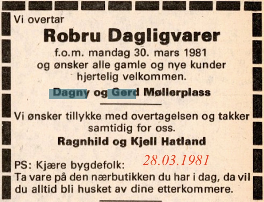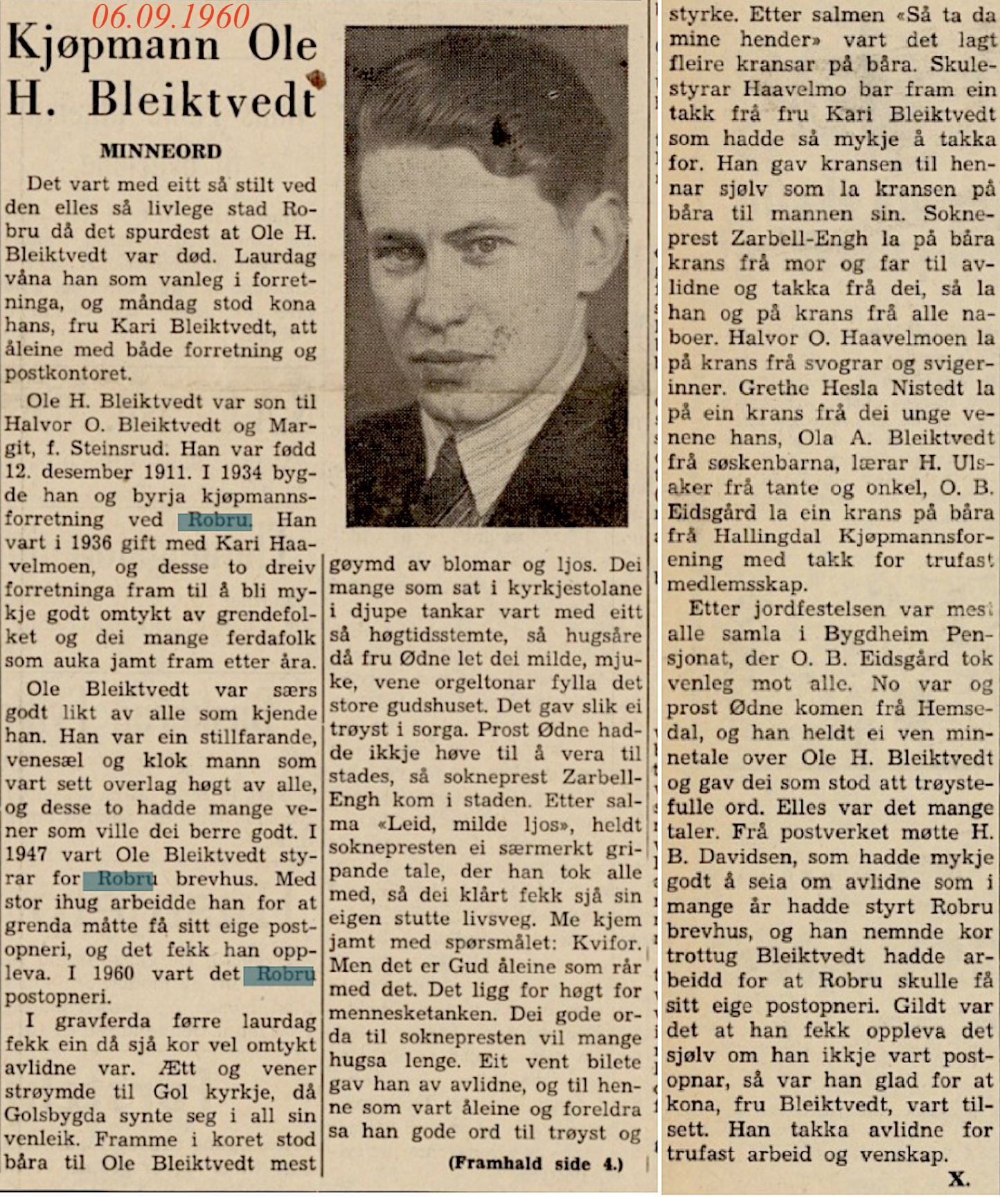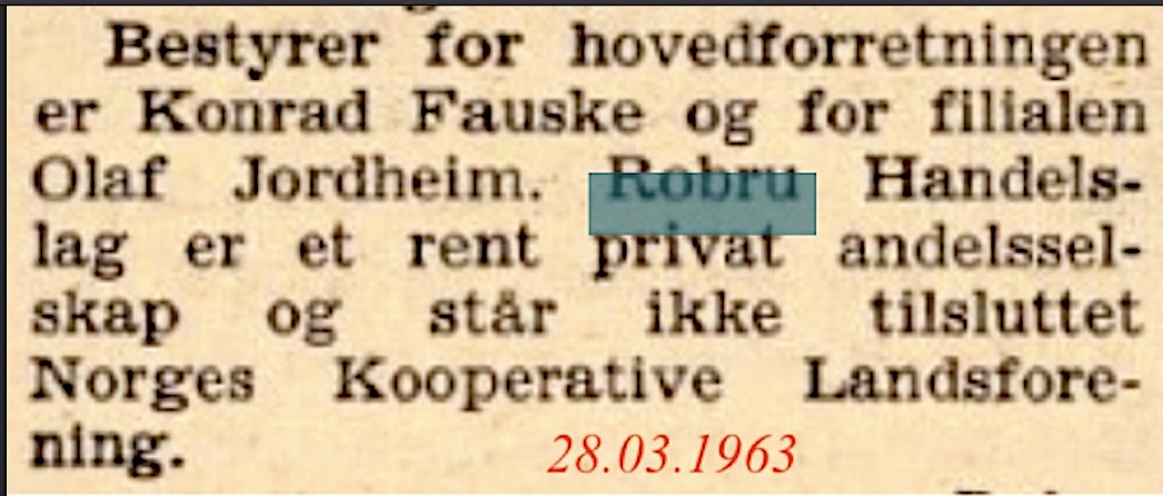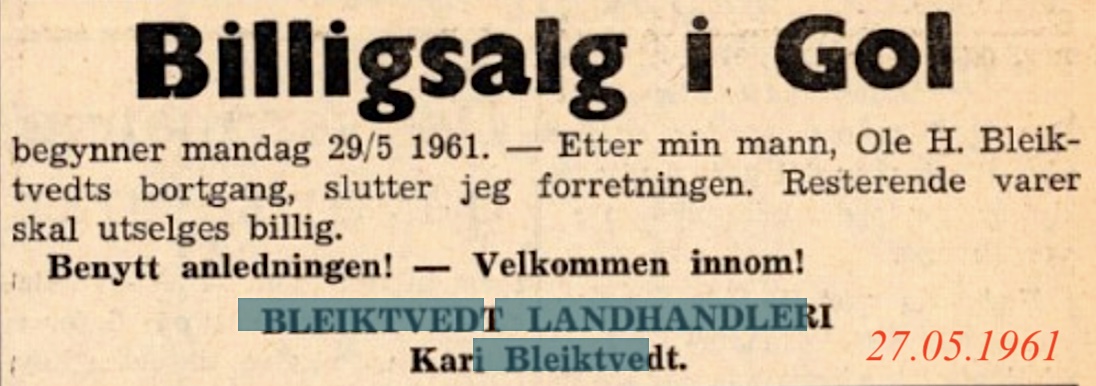 Bleiktvedt landhandleri1934-1961 (27 års drift)(B) (Robru) Ola H. Bleiktvedt(B) byrja kjøpmannsforretning i nybygg på Robru 1934. Han vart styrar for Robru brevhus i 1947, som vart Robru postopneri i 1960. Ola døydde i 1960. Her kan du lesa minneorda etter han(B). Kari Bleiktvedt hadde sin siste annonse i Hallingdølen 27.05.1961(B)