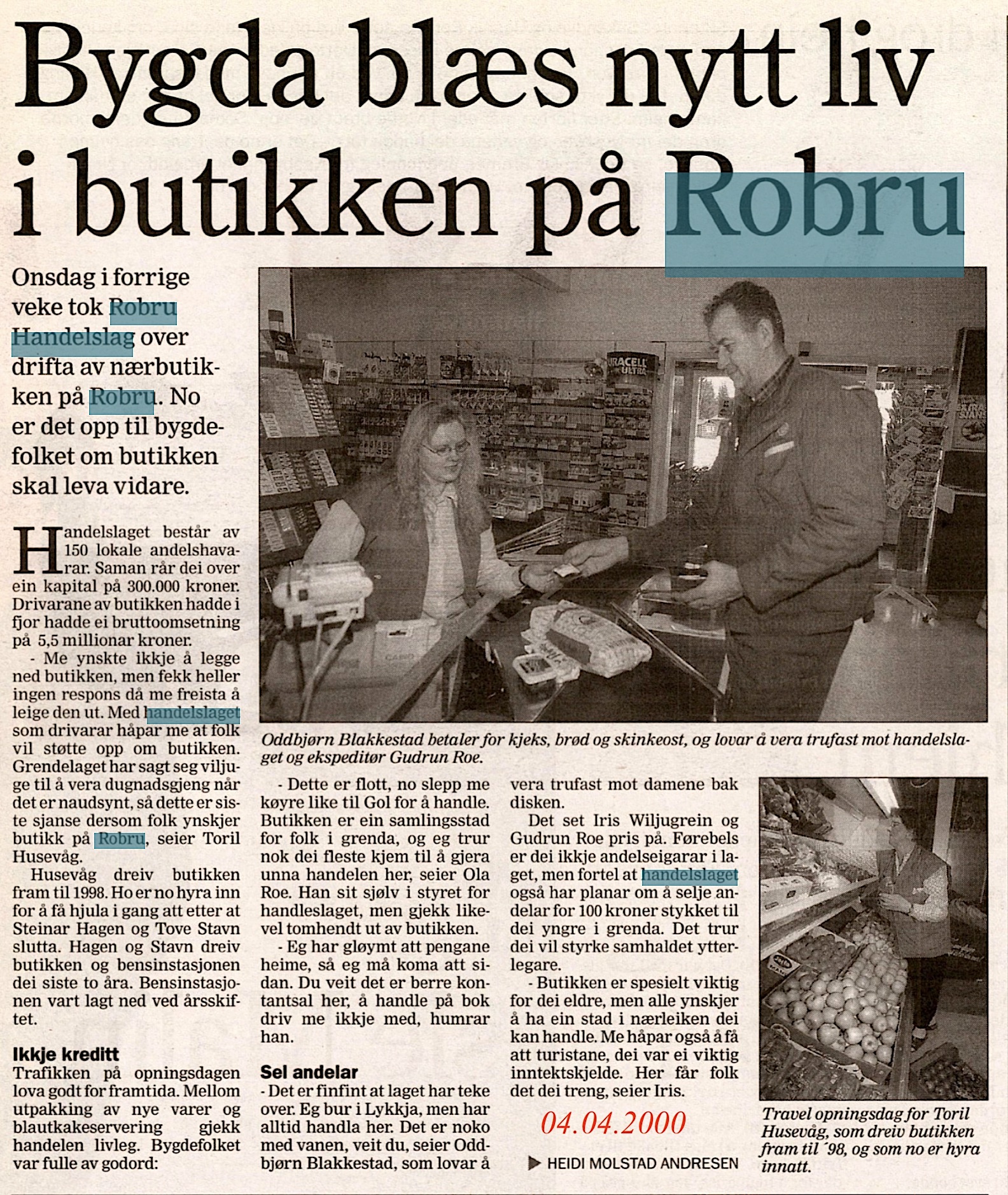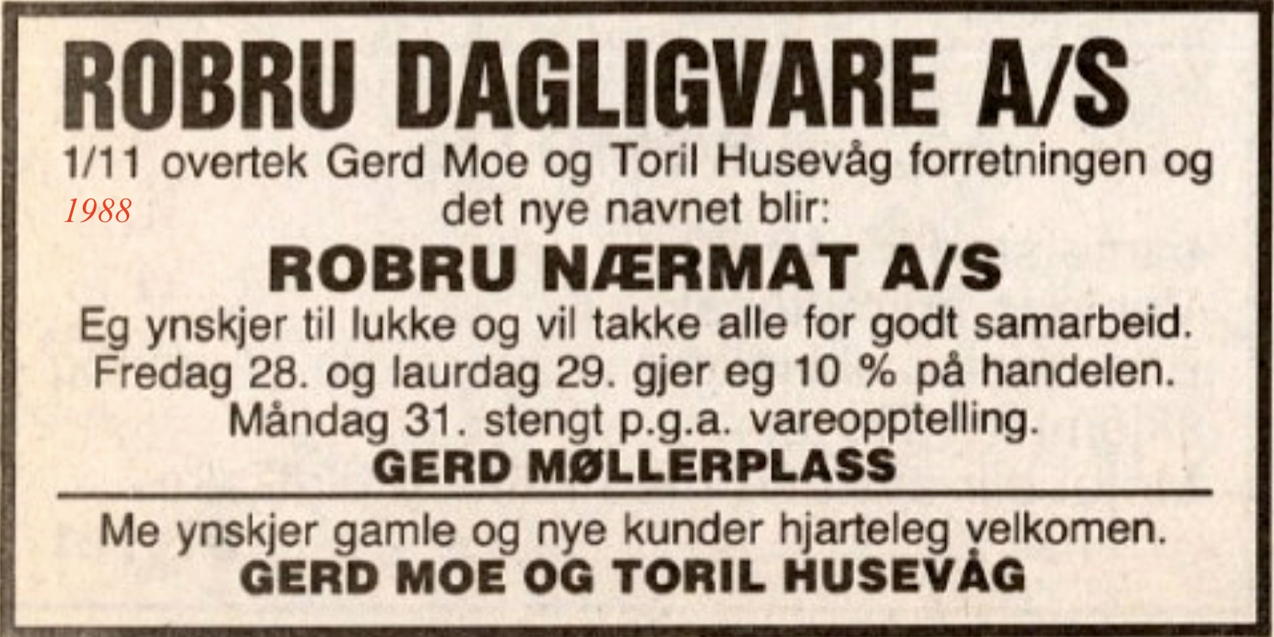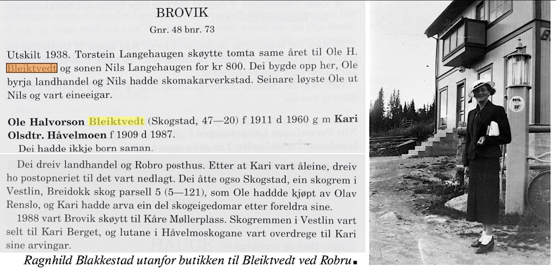 Bleiktvedt landhandleri1934-1961 (27 års drift)(B) (Robru) Ola H. Bleiktvedt(B) byrja kjøpmannsforretning i nybygg på Robru 1934. Han vart styrar for Robru brevhus i 1947, som vart Robru postopneri i 1960. Ola døydde i 1960. Her kan du lesa minneorda etter han(B). Kari Bleiktvedt hadde sin siste annonse i Hallingdølen 27.05.1961(B)