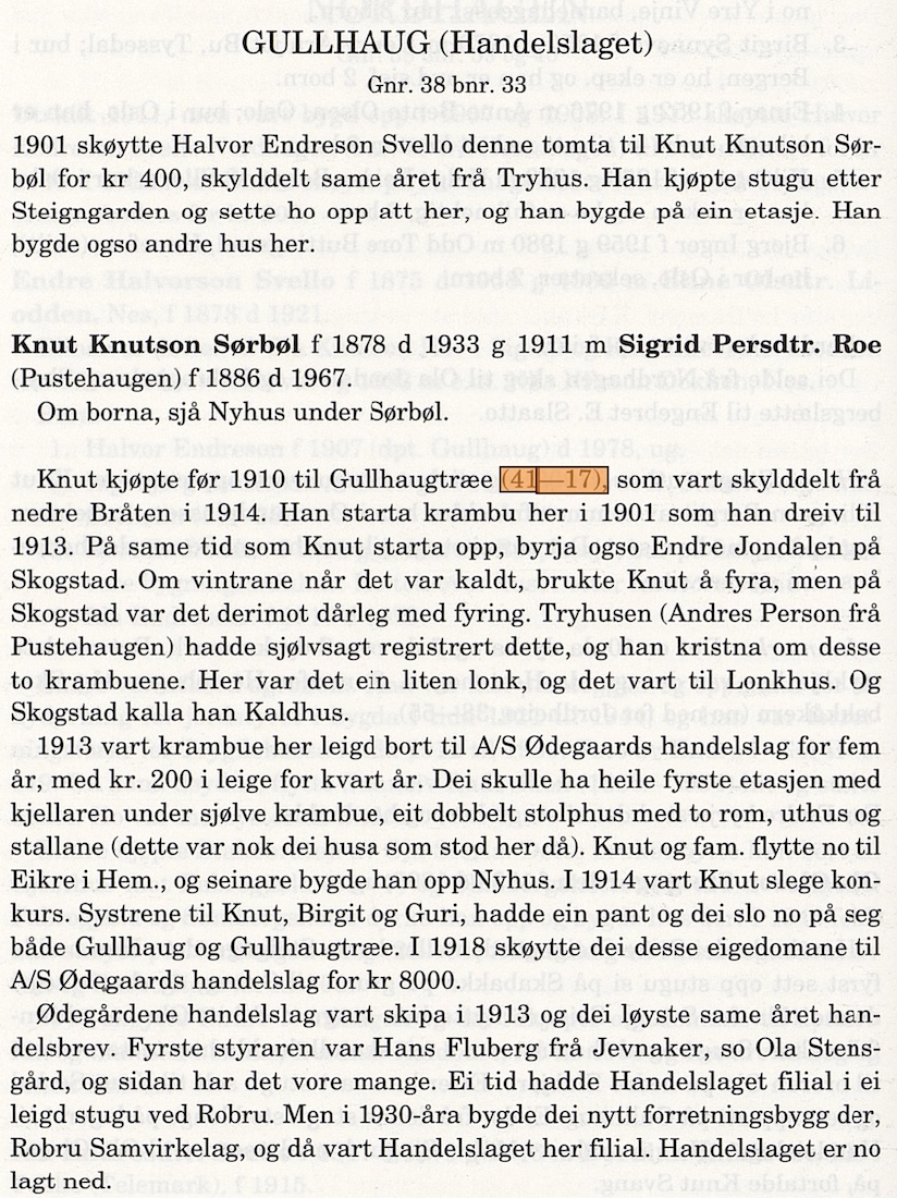 Krambua til Knut Sørbøl1901-1913 (8 års driftstid)(B). Knut Knutson Sørbøl (1828-1933) starta krambu i nybygg 41/17 Gullhaug på Øygardane 1901 og dreiv til1913. Då leigde han krambua bort til A/S Ødegård handelslag. Eigedomen kom på sal i 1918 og handelslaget kjøpte Gullhaug av Sørbøl.