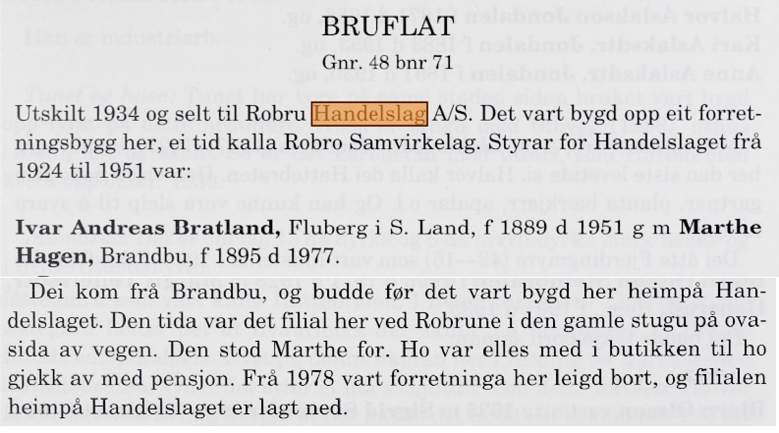 Robru landhandleriA/S 1935- i drift (til 2026 91års drift)(B).(Robru) Eigedomen Bruflat(B) 48/71 vart utskild 1934. Eit forretningsbygg reiste seg, og i 1935 kunne den første styraren Bratland ynskje velkomen til "ein god handel" Litt historie: "Ødegård handelslag, eit aksjeselskap, vart skipa i 1913 og dei løyste handelsbrev same året. Først leigde dei lokale i krambua Gullhaug 41/17 til Knut Knutson Sørbøl på Øygardane. Gullhaug kom på sal i 1918 og handelslaget kjøpte eigedomen av Sørbøl. Ei tid hadde handelslaget i tillegg til Gullhaug, filial på Robru i ei leigd stugu(B)". 1934 kom samvirketanken på grunn av beskatning og kundeutbyte. I annonser frå 1952, 1957 og så seint som 1969 har namnet Robru samvirkelag vorte brukt. Med åra vart Robru meir som eit sentrum på Øygardane og det vart bestemt å byggje nytt forretningsbygg her. Det kom i 1935 og då vart Gullhaug filial. Frå no av var Robru samvirkelag (landhandleri) avdeling I og Øygardane avdeling II. På årsmøtet 1963(B) vart det lagt vekt på at Robru Handelslag er eit reint privat andelsselskap som ikkje er tilslutta Norges Kooperative Landsforbund. Årsmøtet av 1978 stilte spørsmål om det var tid for å leiga forretninga bort. Frå 30. mars 1981(B) til og med 1988 var det Robru dagligvare A/S som styrte. Frå i. november 1988 var det Robru Nærmat A/S(B) som reklamerte for varene sine. I mars 1998 kom Joker Robru(B) hit, og er her endå. Februar 2000 vart det leiarskifte(B)(B) I 2025 vart Joker- butikken døgnopen(B).