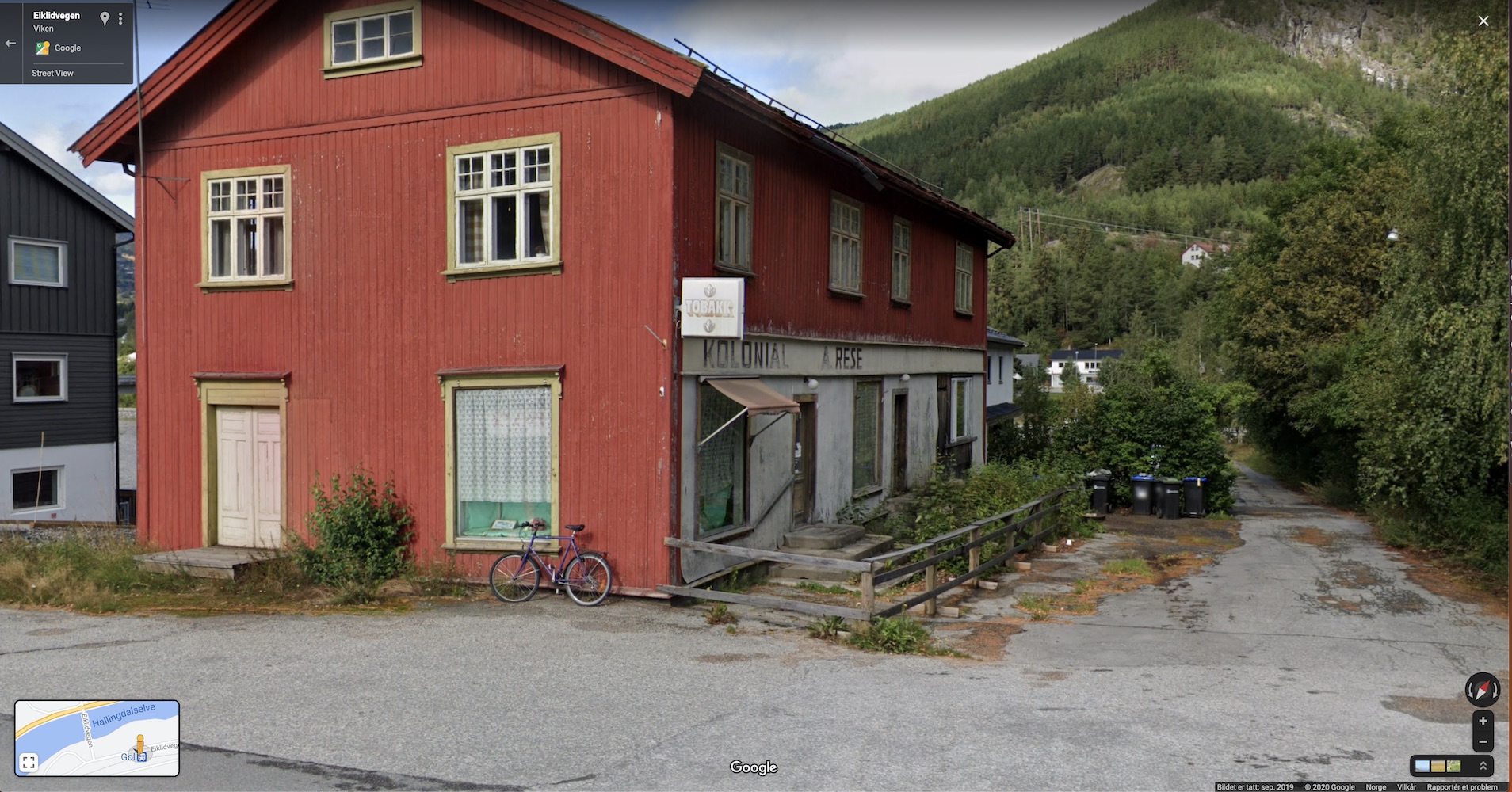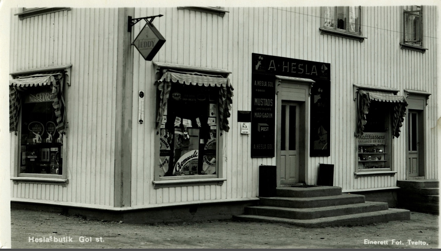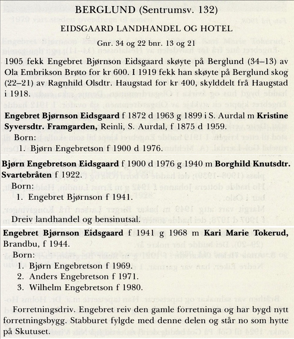 E. B. Eidsgaard 1892-1989 (98 års drift)(B). Utviklinga av Eidsgaard´s starta med Vilhelm Bjørnson Hersgard/Eidsgaard (1806-1871)(L) ved kjøp av møllebruk og vatnrettar i Heslafossen i 1852(L). I den gamle kvilestugu ved kverna byrja Engebret Bjørnson Eidsgaard (1872-1963) med krambuhandel i 1892(B). Bergland (34/13)(B). Engebret eigde frå før halvdelen av Heslafossen. Ein ser av bildet ovafor at Engebret har snudd kvilestugu og bygd på eit eller to rom. I området opp mot valdresvegen bygde Eidsgaard ein lagerbygning(B) i 1924. Nyebutikken kom i 1927(B), og fekk eit tilbygg mot elva 1939(B). Lagerbygningen vart rive 1948/49. Truleg for å gje veggrunn i samband med oppgradering av veg og bru grunna kraftutbyggjinga i 1958(B). Eit bilde frå 1946(B) viser brua frå 1943 og den omtalte lagerbygningen. Det går elles fram av bilde at det står ein MIL bensinstasjon ved butikken. Skal ein tru på alt som står i Hallingdølen, har her vore bensinutsal i ei eller anna form frå ca.1918. (Frå 1922 MIL. I 1953 vart MIL til BP. Frå 1976 Norol). Eidsgaard bygde nytt forretningsbygg, Eidsgaard Matsenter, like ved gamlebutikken som opna den 18. juli 1980. For å unngå å stoppa handelen vart varene ført over frå det gamle til det nye bygget før gamlebutikken vart riven fredag den 11. juli 1980(B). Norolstajonen(B) vart rive i 1988, men kom i ny utgåve lenger ned i Gol sentrum(B). Etter mange gode år vart Eidsgaard matsenter avvikla i 1989(B) og lokala vart bortleigde.