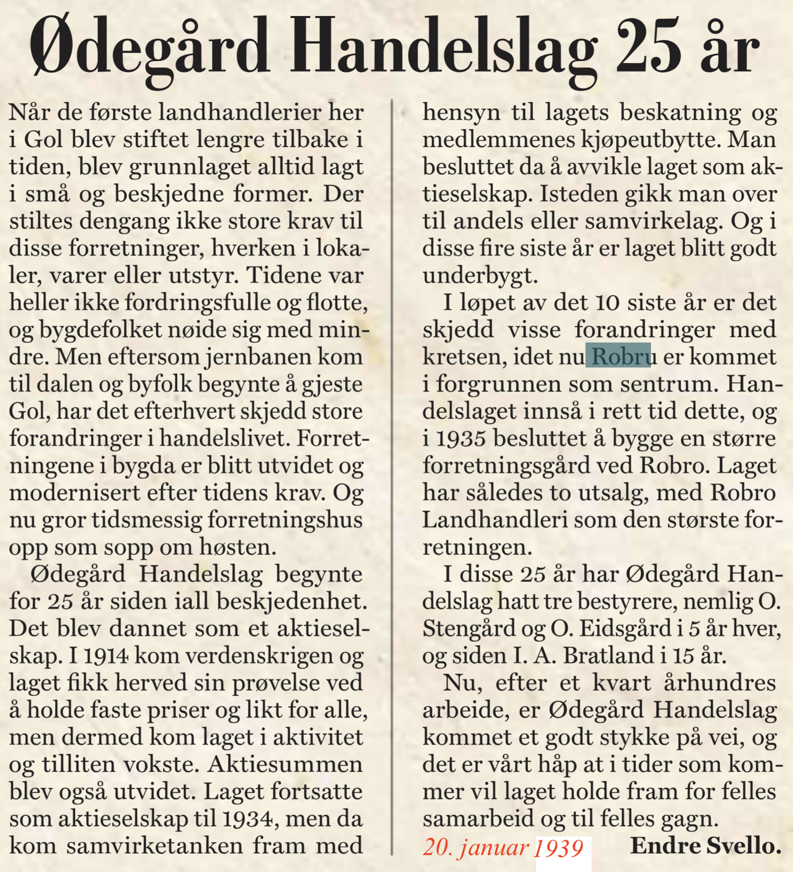 Ødegård handelslag1918-1989 (72 års driftstid)(B)(Øygardane) Ødegård handelslag, eit aksjeselskap, vart skipa i 1913 og dei løyste handelsbrev same året. Først leigde dei lokale i krambua Gullhaug 41/17 til Knut Knutson Sørbøl på Øygardane. Gullhaug kom på sal i 1918 og handelslaget kjøpte eigedomen av Sørbøl. Ei tid hadde handelslaget i tillegg til Gullhaug, filial på Robru i ei leigd stugu(B). Med åra vart Robru sentrum på Øygardane og det vart bestemt å byggje nytt forretningsbygg her. Det kom i 1935 og då vart Gullhaug filial. Frå no av var Robru samvirkelag (landhandleri) avdeling I og Øygardane avdeling II. Av årsmøtereferata kan ein lesa at det har vore planar om nybygg over tid, når tida var lagleg heiter det. Alt i 1942 vart det gjort vedtak, det same så seint som i 1963, men nybygget har endå ikkje kome. Innvestering i kjøleroma(B) har og vore drøfta for i mai 1963 var det plan om å starte mjølkesal. Den første styraren var Ola Stensgård. Han og O Eidsgaard fem år kvar. So var I.A. Bratland her i 15 år. Olaf Jordheim (1922-2008) var den siste som handla her på Gullhaug. Han kom hit i 1947 og var her til juni 1989, då var det kroken på døra. Dei 20 siste åra har han hatt ansvaret for drifta sjølv, men leigde lokala. Du kan lesa om jordheim her(B). Laget hadde 25-års jubileum 1939(B)