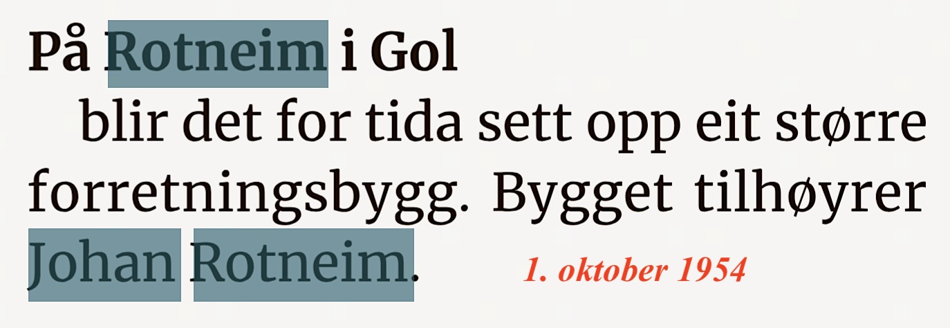 Heimtun landhandel 1954-1972(19 års drift)(B) (Rotneim)1952 kjøpte Johan Roneim og søstera Margit seg tomt(B) til eit forretningsbygg. Johan og Margit fortsatte i Hansegard til 1954 då dei flytta inn i nybygget over vegen som dei kalla Heimtun(B). Søk i Hallingdølen viser at John fekk løyve til ølsal i både 1946 og 1972(B). Når butikken vart lagd ned finn eg ikkje bevis på, men den var i alle fall i drift november 1977. John døydde i 1992.