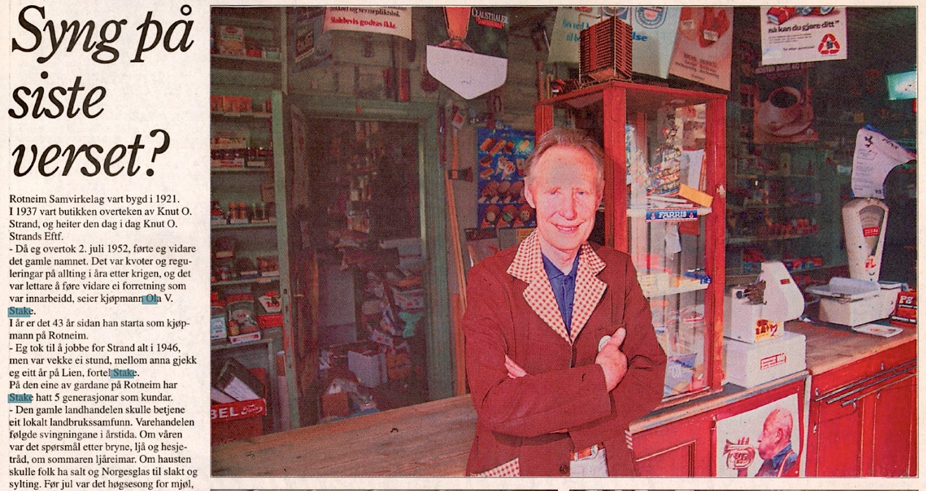 Rotneim samvirkelag 1921-1995 (75 års drift)(B)(Rotneim) I nybygget "Samhald" dreiv Eilev Hanseplass m. fleire (aksjeselskap) eit samvirkelag i 1921. Tomta hadde Eilev og kompisane kjøpt av enka til Knut Olson frå Øvre Rotneim. Dei byrja først å handle i leigde lokaler i Hansegard(B) før dei bygde Samhald. Men etter 2-3 år i nybygget slutta dei som kremarar, og leigde bort lokala. 1937 skøytte Eilev Samhald til Knut O. Strand(B). Strand handla her til han skøytte eigedomen til Ola V. Stake1952. Knut hadde tidlegare handla i Teigstad, Rotneimsvegen 499, i huset han og Ola S. Teigen bygde i 1933. Ola V. Stake dreiv landhandelen til hausten 1995(B), men fortsatte med sal av antik(B) . Når google- bilen køyrer forbi her oktober 2024 er flagget heisa og skiltet open på plass(B).