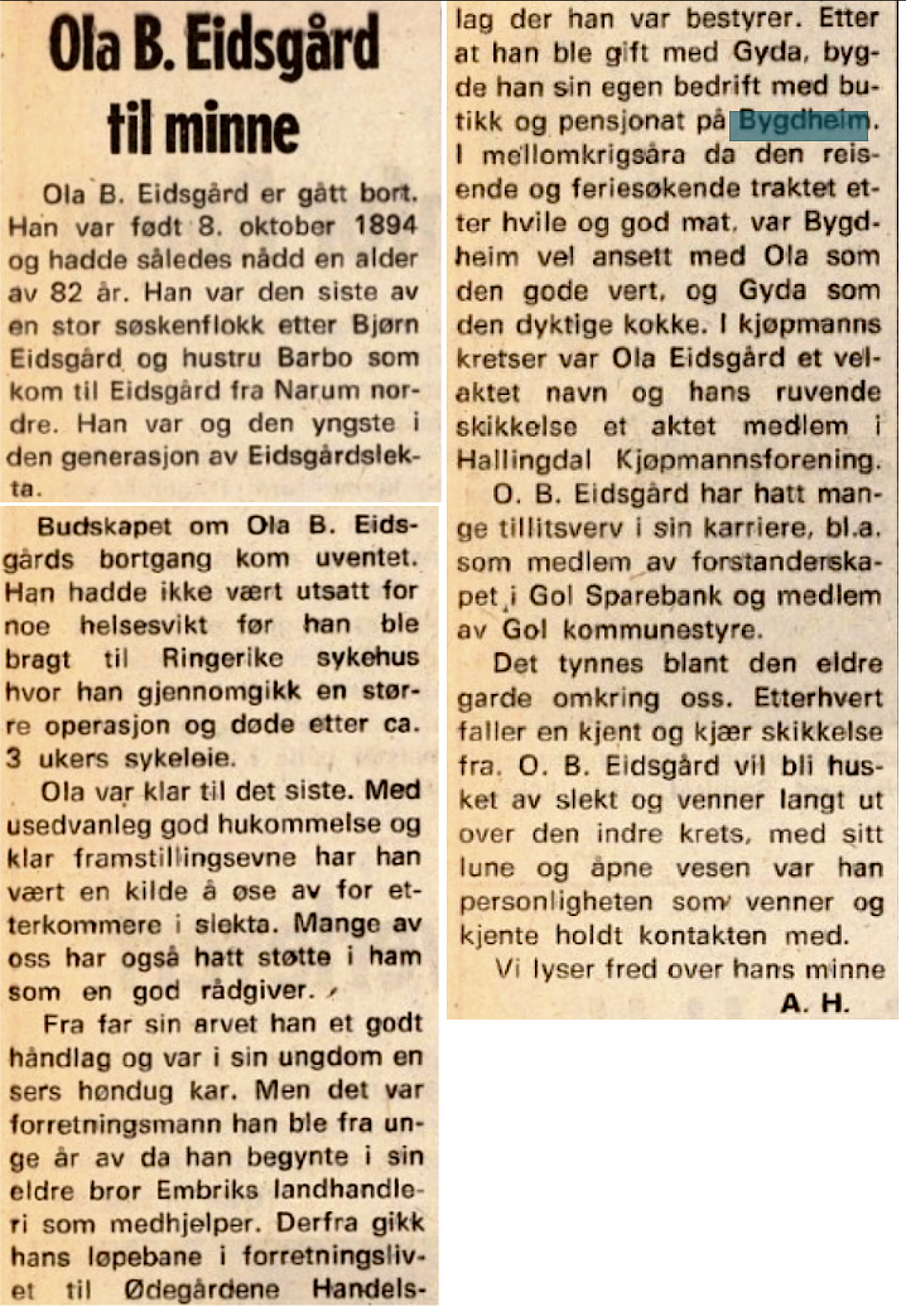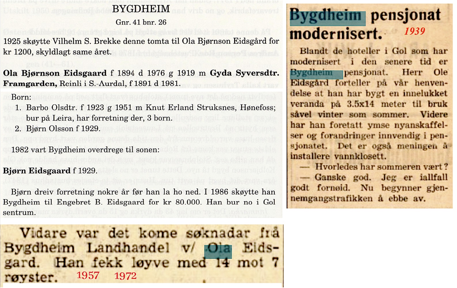 Bygdheim landhandel 1925-1982 (58 års drift)(B)(Øygardane) Ola Bjørnson Eidsgaard(B)(L) (1894-1976)(B) dreiv landhendel på Øygardo samtidig som han dreiv Bygdheim pensjonat(B). Staden vart driven som kombinert butikk og pensjonat til 1962 seier Bjørn i eit intervju med Hallingdølen 1977 og viser fram butikken etter utvidelsen samtidig som han formidlar korleis ein kan konkurere med dei store butikkane nede i Gol sentrum(B). Men i desember1982(B) var det kroken på døra. Søk i Hallingdølen viser at Bygdheim pensjonat var i drift til 1968. Der var det både bryllup og minnesamvær.