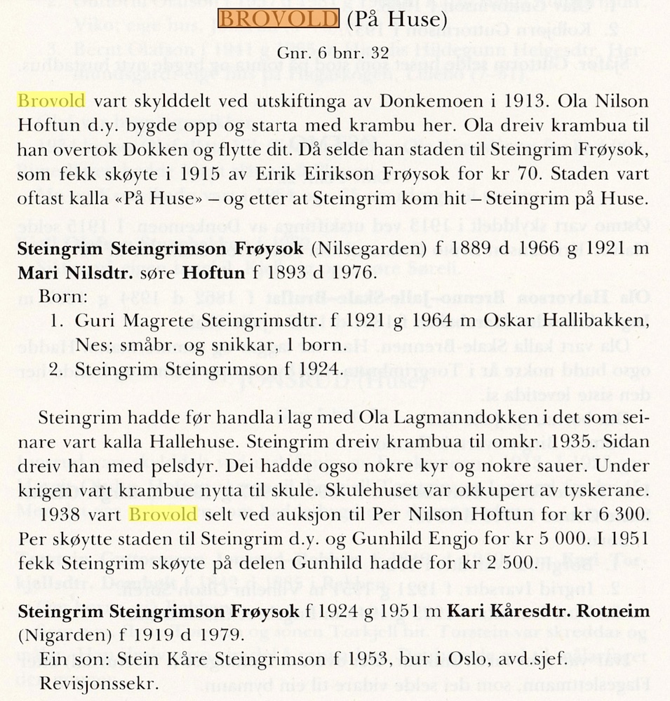 Krambua Brovold 1913-1935 (25 års drift)(B)(Donkemoen) Frå 1913 drei Ola Hoftun(B) handel i Brovold som ligg rett over vegen for Herad handel. Han dreiv her til han selde Brovold til Steingrim Frøysok, som handla her til 1935. Brovold vart seld på auksjon i 1938..