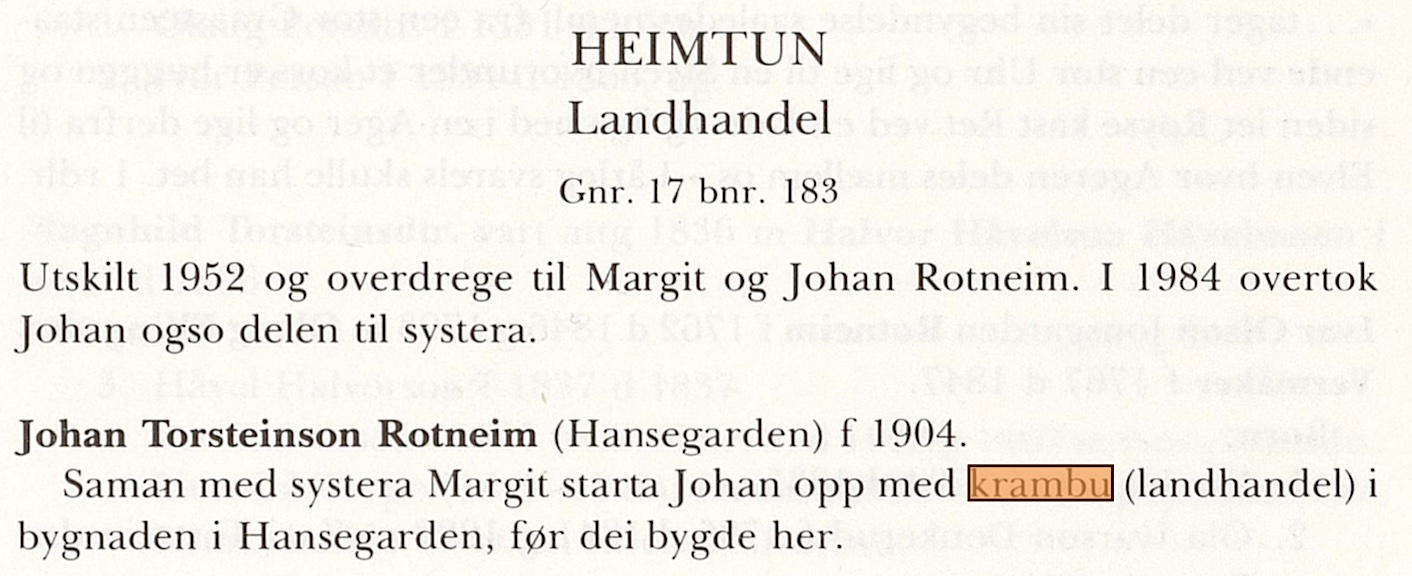 Krambua til Torsten Rotneim 1906-1954 (48 års driftstid)(B). Torstein Knutson (Gautehaugen) Rotneim (1857-1941) og frå Hansegarden 17/1(L). Som ungdom dreiv han både med skreddering, tømring og snekkering til han starta med krambu i Donkemoen saman med Guttorm Syverson Glenna(B). Sjå Hallehuse. 1883 kom dei under tiltale for å ha skrive falskt. Sidan skilde dei lag. Etter ein tur til amerika starta Torstein krambu i Gurigarde(B) på Rotneim i 1906. Etter 2 år flytta dei attende til Hansegard(B) med krambua. Han dreiv krambua i øvre enden av stugu. So leigde han krambua bort til Eilev Hanseplass m. fleire (aksjeselskap) eit samvirkelag. Etter ei tid byrja Torstein å handele i andre enden av stugu saman med sonen Johan og dottera Margit. 1921 flytta samvirkelaget frå Hansegard og inn i nybygde samhald(B). 1952 kjøpte Johan seg tomt(B) til eit nytt forretningsbygg. Johan og Margit fortsatte i Hansegard til 1954 då dei flytta inn i nybygget over vegen som dei kalla Heimtun(B). John døydde i 1992. Sjå Heimtun landhandel.