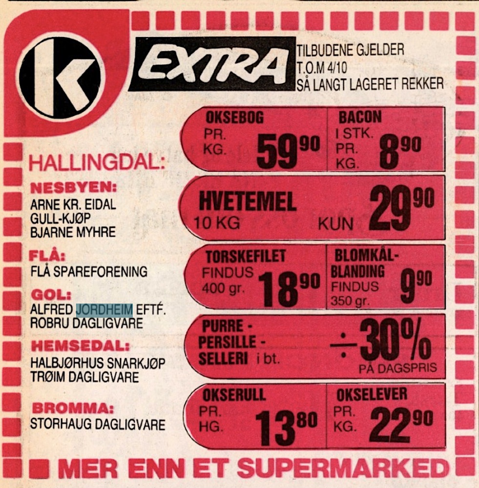 Alfred Jordheim 1964-1986 (23 års drift)(B). Fredag den 14. februar 1964 kunne Alfred Jordheim (1927-2000) og Oddbjørn Viko ynskje kundane velkomne i nye lokale i Sentrumsvegen 67(B). Tomta(B) ligg like ved sida av forretningsbygget dei flytta frå. Alfred dreiv kolonialforretning, Oddbjørn skobutikk. 1983 var det innbrot i butikken(B). 2.oktober 1986 var siste annonsa Alfred Jordheim hadde i Hallingdølen(B).