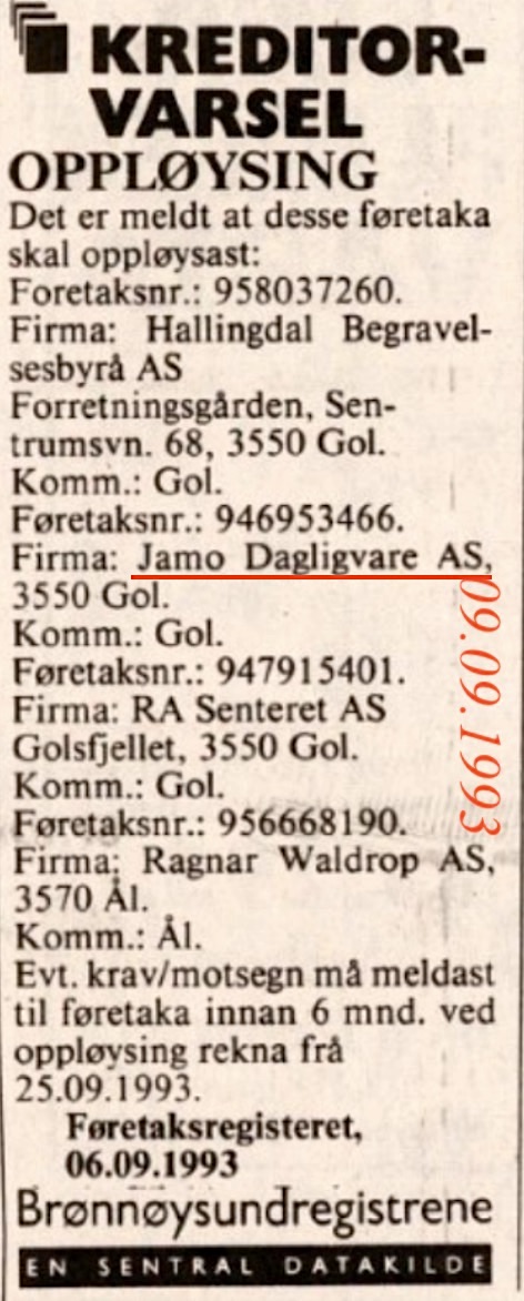 Jamo Dagligvare1976-1993 (17 års drift)(B) Det første kjøpesenteret i Hallingdal kom i Nesbyen. Men den første rulletrappa kom i Hallingsenteret sier Jan Erik Mortensen frå Stovner som stod bak Hallingsenteret(B). Mortensen opna Jamo Dagligvare i Hallingsenteret 2.des.1976(B). 1979 tok Jan Svello over Jamo Daglegvare. I august 1993 vart Jamo oppløyst(B) men Svello held fram i same lokala med kjeda Spar til juni 2001. Då flytta han over gata til LK-senteret, tok over lokala til AKA og fortsatte med kjeda Meny der. I 2017 gav han seg.