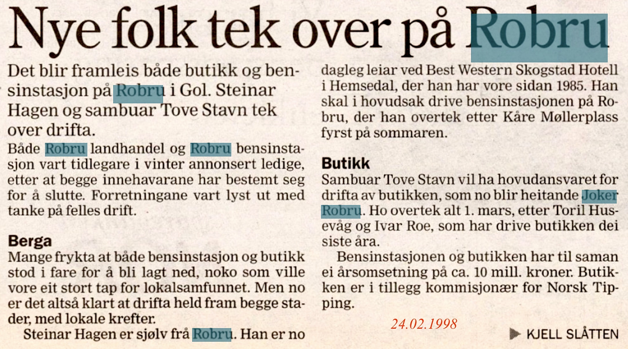 Bleiktvedt landhandleri1934-1961 (27 års drift)(B) (Robru) Ola H. Bleiktvedt(B) byrja kjøpmannsforretning i nybygg på Robru 1934. Han vart styrar for Robru brevhus i 1947, som vart Robru postopneri i 1960. Ola døydde i 1960. Her kan du lesa minneorda etter han(B). Kari Bleiktvedt hadde sin siste annonse i Hallingdølen 27.05.1961(B)