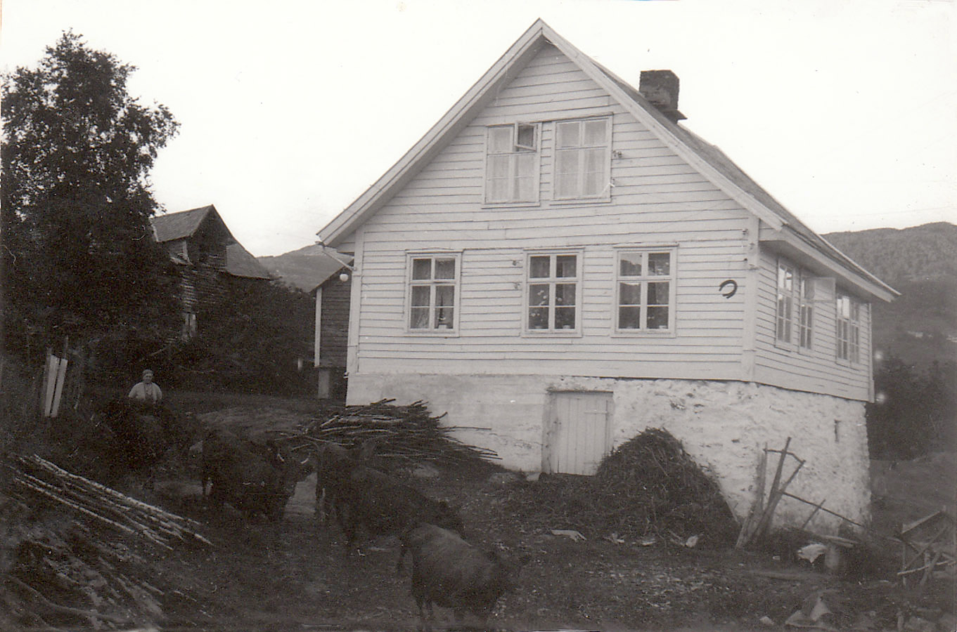 Stova og tunet heime før Storeper- fjøsen datt ned sist på 70- talet og stabburet forsvant. Stabburet som vart opattbygd her etter at stormen tok det 1943. Då stod det der Øystein har uteplass. Her har mor henta ned kyrne frå Hagen eller innaforteigane. Det var alltid ved og tros utafor kjellardøri. Ser at losholten på loftet og stova står open, det tyder på at her er det feriefolk. Men so hende det noko i tunet