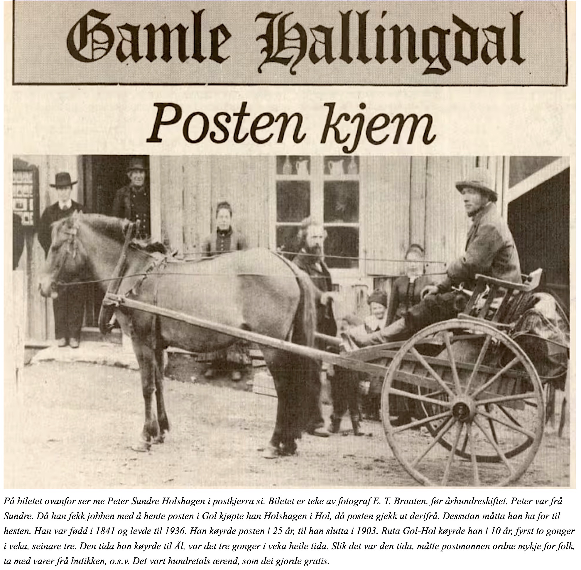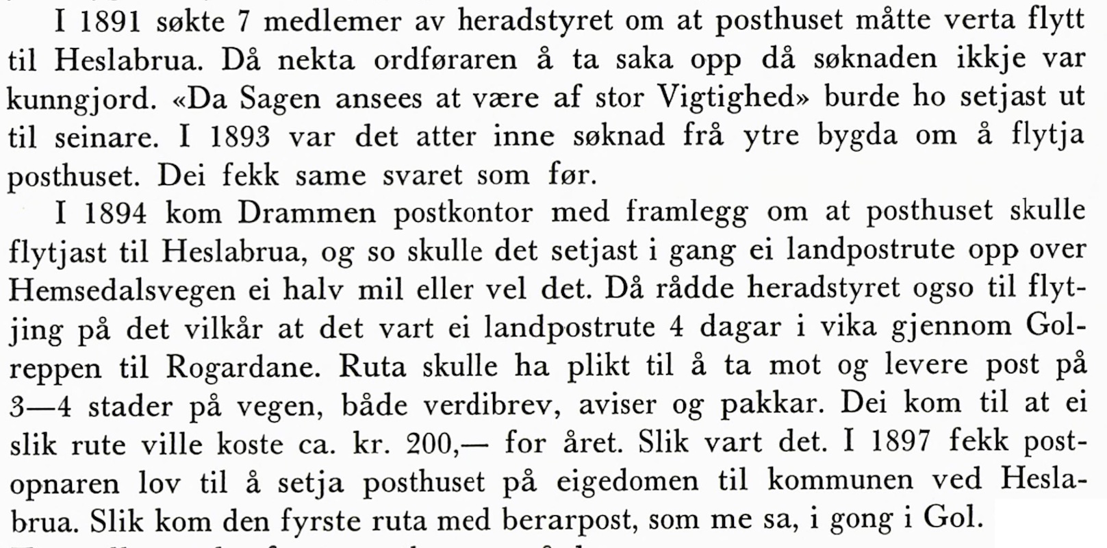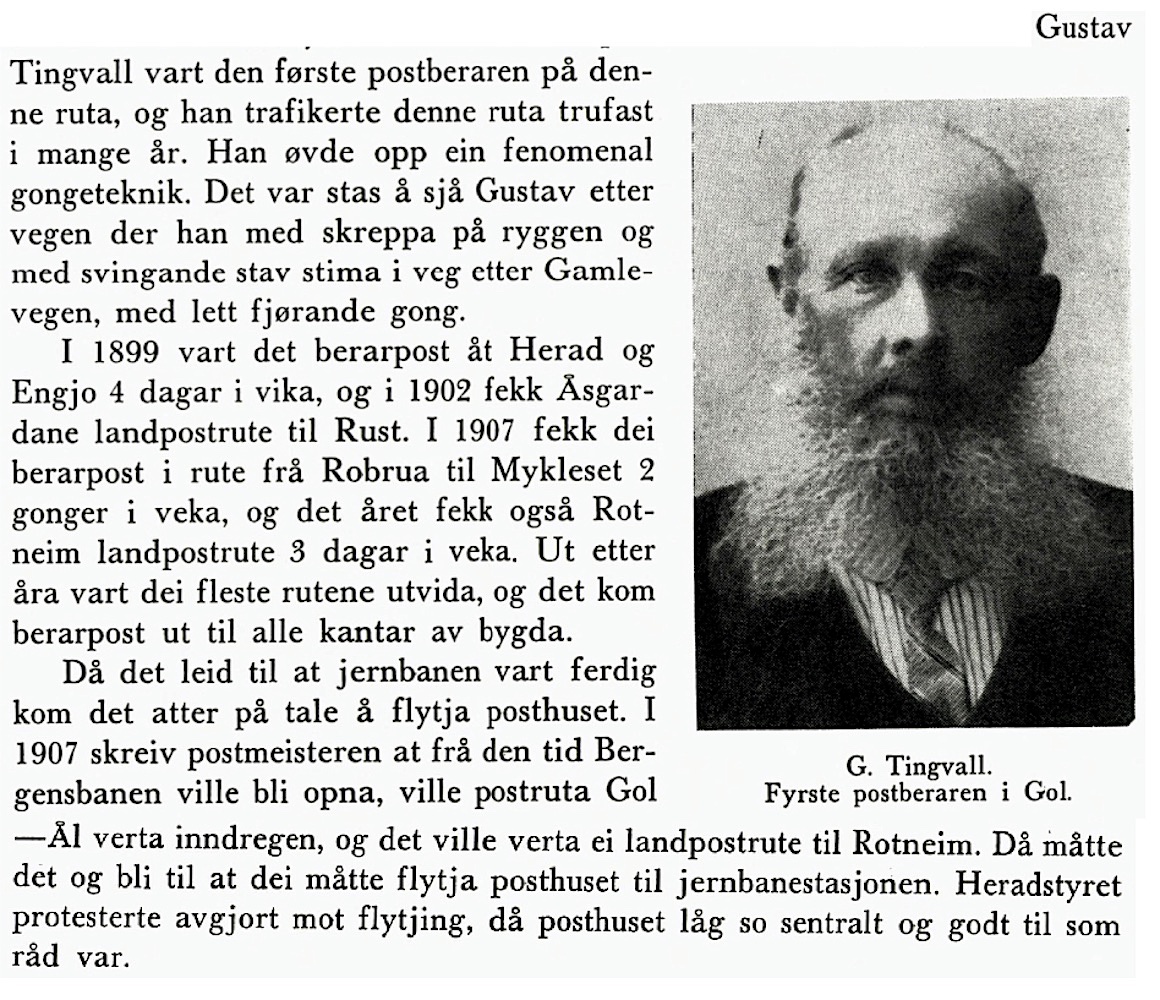 I 1897 vart posthuset ved Teigen flytt til Bergland ved Heslabrua. Same år vart G.Tingvall det første landpostbodet i Gol. Tingvall bar posten oppover til Ro-gardane fire gonger i veka.