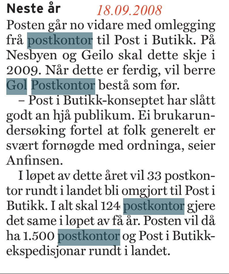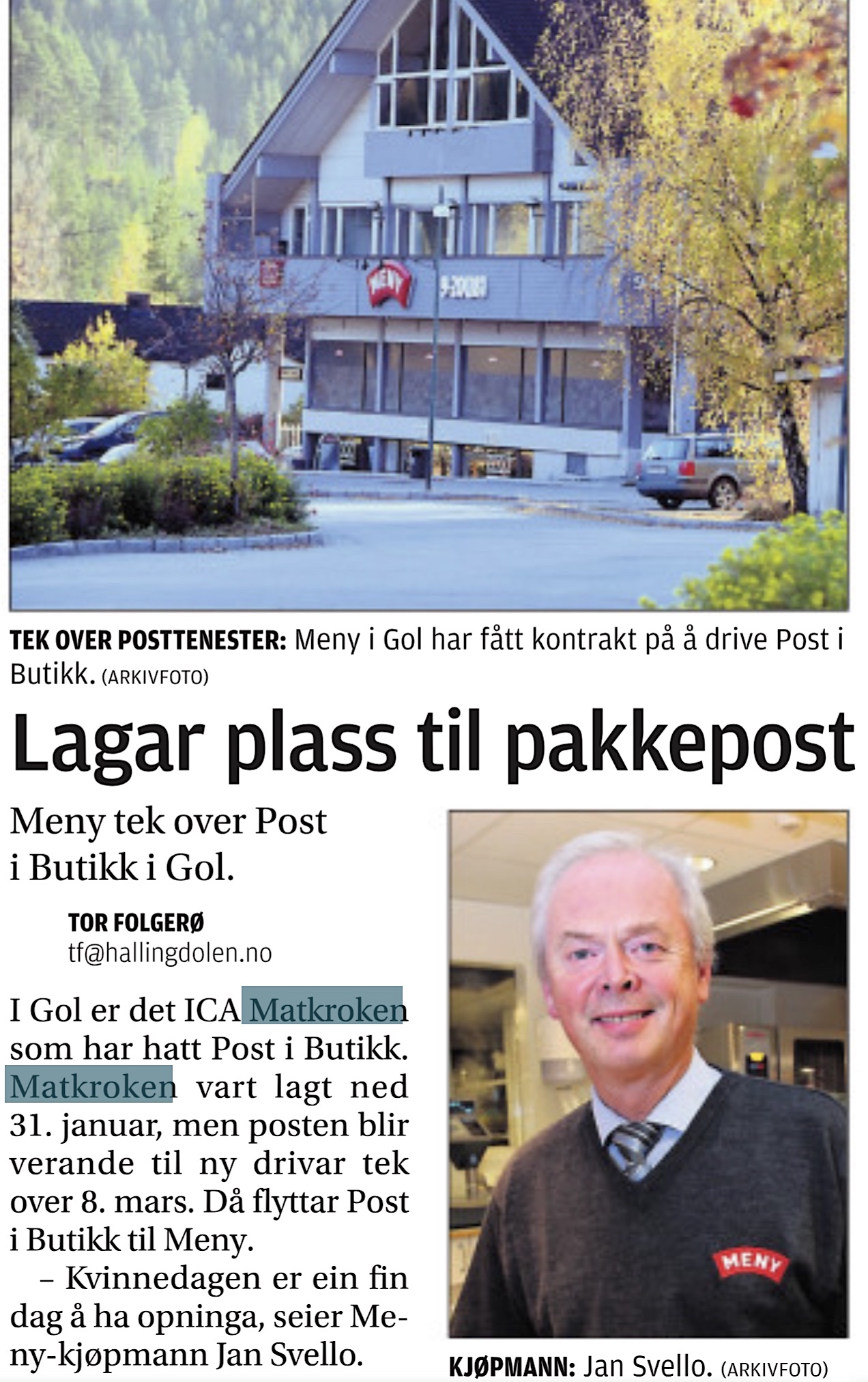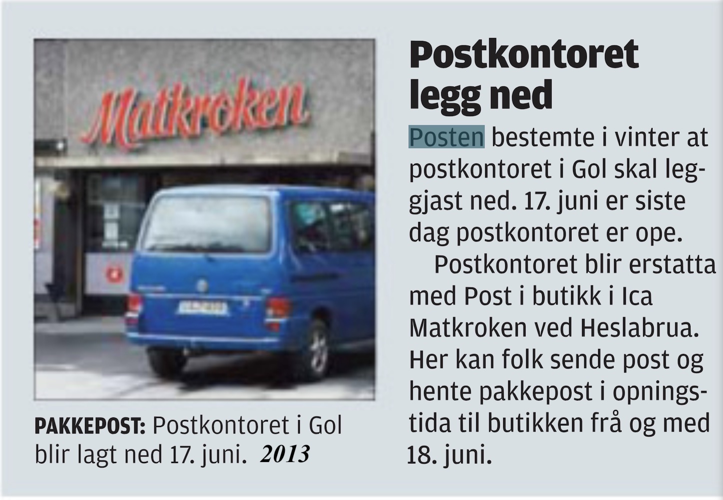 Tida var inne for omorganisering ved Gol Postkontor 2013. Omberingsavdelingen flytta til Elvevegen 16 på Glitre, og den18.06.2013 var pakkeposten operativ ved Matkroken matsenter ved Heslabrua. ICA eigar Coop, la ned Matkroken 31. januar 2016 og posten flytta då til LK- senteret. Meny overtok pakkeposten. 1.oktober 2017 overtok matvarekjeda Spar post i butikk. Dei avløyste då Meny i LK- senteret.