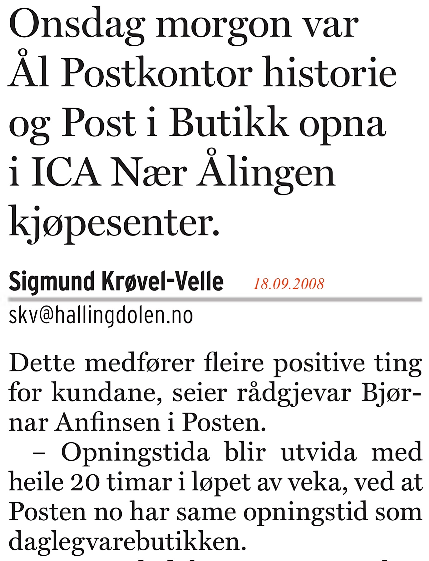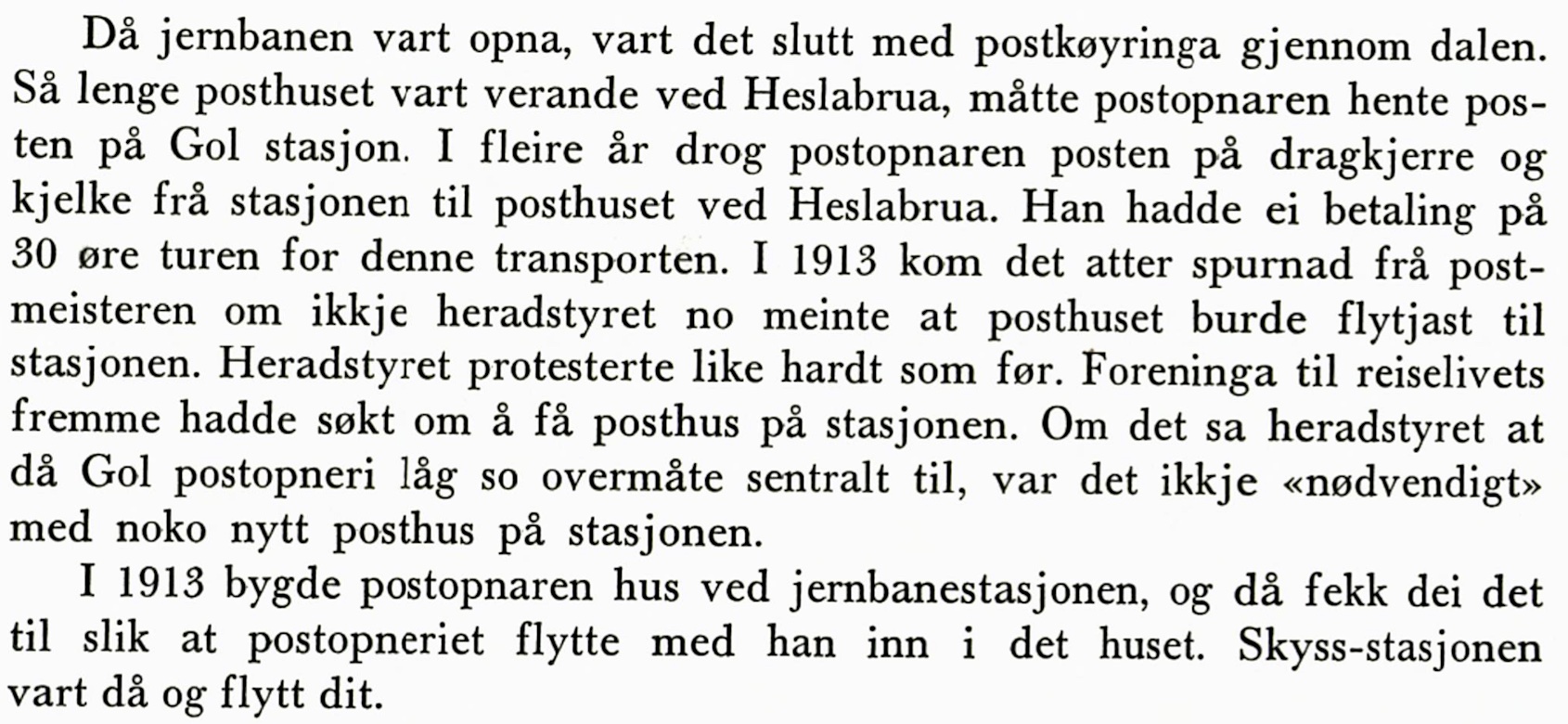Då jernbana kom i 1909 vart det krav om at posthuset burde bli flytt ned til stasjonen ettersom posten no vart sendt med toget, og hesterutene vart lagt ned.