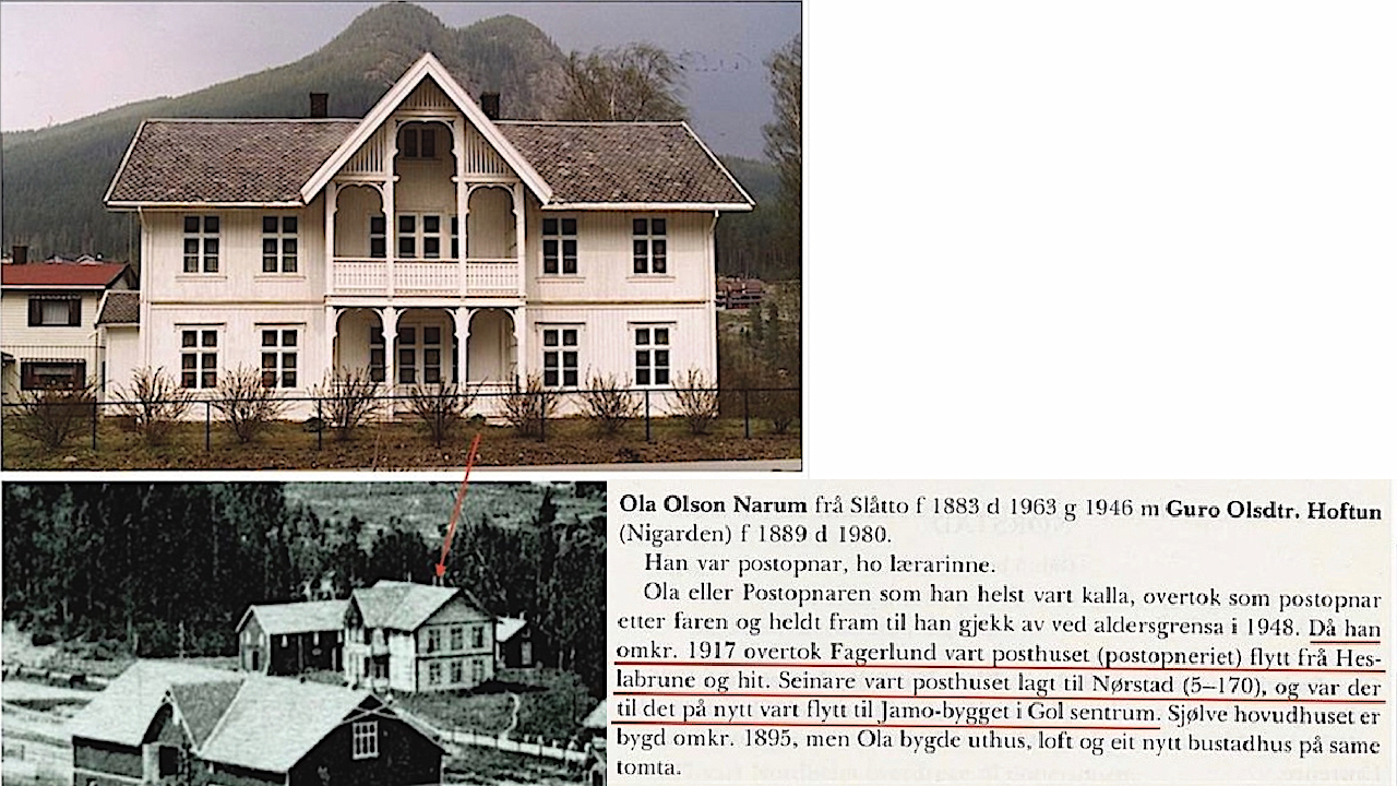 I 1913 -17 kjøpte Narum hus ved stasjonen, Fagerlund dermed vart postkontoret lagt dit. Meir (L) og (L)
