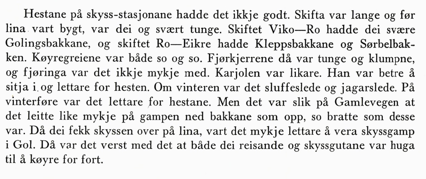 Den tida gjekk vegen frå Heslabrua til Robru opp gjennom Golreppen, vidare framover Øygardane og ned til Robru. Ein reisande postførar fylgde postsendinga frå Rigerike til Lærdal. Han leverte og tok i mot post på alle postopneri etter vegen. Postopneriet i Gol tok og i mot posten som skulle til Torpo, Ål og Hol og vart skyssa derfrå med hestetransport.