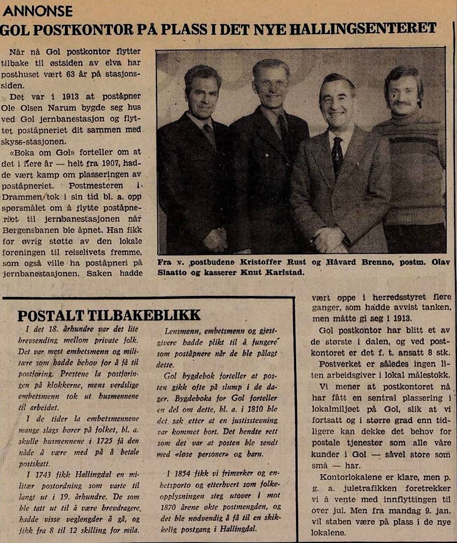 Då gamlekyrkja vart rive vart materialane i sakrestiet og koret nytta til eit nytt posthus på nedsida av Hemsedalsvegen, ned i Teigen, og det var då Ola Narum (Slåtto)(L)(L) overtok som postopnar, og sonen etter han.