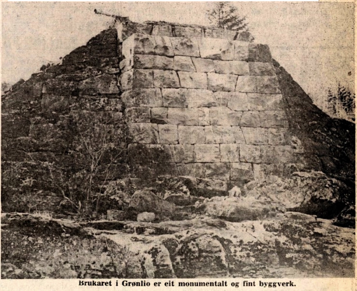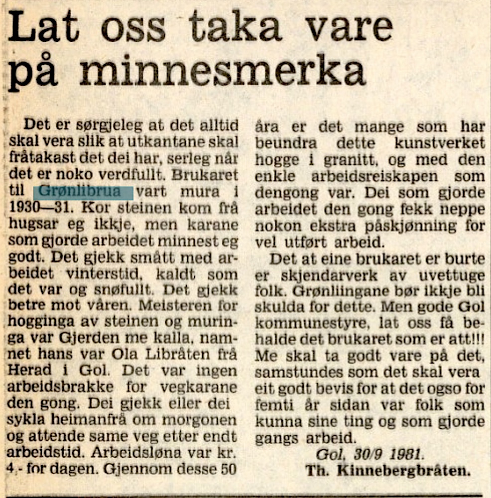 Brukara frå Grønlibrua frå 1931(B) vart det noko meiningsstrid om. Det eine brukaret står att ved Hemsil, ved oppgangen til Grønlio. I kommunestyremøte i Gol sept 1981 vart det, mot ei røyst, vedtatt at steinen i dette brukaret skal nyttast til steingjerdet ved kyrkja i Gol. Seinare har det kome ein rekke reaksjonar på dette vedtaket, med lesarinlegg og telefonar til Hallingdølen. Det blir peikt på at dette var eit alt for hasta vedtak. Saka bør takast oppatt slik at bygda kan få ha dette minnesmerket som eit døme på eit særs fint handverk, likesom eit vitnemål om tida då slikt vart gjort så og seie med berre handemakt, og i eit utruleg slit, ofte i snø og kulde. Det kan vera av interesse å minne om eit og anna i samband med denne saka. Så langt fram som til i 1914 hadde ikkje kommunen løyvd pengar til vegbygging. Likevel hadde det sidan før hundreårskifte vorte bygt mange og lange vegar i bygdene, arbeid som bøndene sleit fram sjølve. Men i 1914 vart det løyvd 60 kroner til å vøle på Buksebrune. (Golsboka). Det er likevel eigentleg ikkje før i dei seinare 25-30 år at det verkeleg kom fart i det kommunale engasjement i vegbygginga utover bygdene. I 1870-80 tok bøndene i Grønlia fatt på å få veg. Dei måtte ta til fra Robrua (på sørsida) og arbeidde seg oppover bit for bit, og kom fram til Lisalien i 1881. Men vegen var bakkut mange stader, og han gjekk innunder Eidsberga, over Steget. Der var det ikkje ufarleg. Det gjekk ras, både sommar og vinter. Bøndene la på seg pliktarbeid for å halde vegen vedlike, 8 dagar om våren og det same om hausten. Denne vegen måtte bygda greie seg med i omlag 50 år, då det vart bygt bru over Hemsil. Det eine karet står att enno, og det er det brukaret som skal rivast. Ettersom den gamle vegen var som han var, tok bøndene opp tanken om ei bru heller, for å koma rett inn på vegen Gol - Hemsedal. I 1929 søkte dei interesserte om eit tilskot på 10 700 kroner til ny bru. Folket i Grønlio tok på seg å bygge vegfyllinga inntil brukaret. Dette arbeidet var åleine rekna til 20 700 kroner. Kommunestyret løyvde pengar og fylket tok sin 1/5 av kostnaden, og bruarbeidet kom i gang. Dette arbeidet gjekk stort sett for seg om vinteren, og stein vart kila til og køyrt fram med hest. I snø og kulde kom stein på stein på plass, nitid samanhogge av fyrsteklasses fagfolk. Det gjekk med mange tusen lass stein til den svære fyllinga på Grønli side. Heile vinteren køyrde bøndene stein i frå røysar som låg vel ein kilometer oppe i grenda, i alt vesentleg stein som var tatt opp med handmakt, for å vinne ny jord til gardane. Tilsamen ligg det såeis ein eineståande innsats frå folket i Grønlio for veg og bru. Fleire i Grønlio hugsar godt til denne brubygginga. Men gamle brua vart for smal slik tida utvikla seg med biltrafikk og det som fylgde med. Det vart bygt ny bru like ovanfor. Jernkonstruksjonen på gamle brua vart fjerma, men brukara stod att. Litt for raskt var det eine brukaret, inntil riksvegen, øydelagt ved at ein privatmann fekk løyve til å ta stein der. Men det andre, på Grønli sida, og som viser i frå riksvegsida, står urørt att, reint som eit monument(B) å sjå på. Det er ønske å ha steingard rundt kyrkjegarden. Det er fint. Men me torer gjera merksam på at det treng no slett ikkje vera hoggen stein. I alle tilfelle vil ikkje stein frå dette brukar et bli nok. Kommunestyret i Gol ser neppe dette som nokon prestisjesak. Det er slikt som skjer i farten. Etter som det er komne så mange klare signal om at dette brukar et bør bevarast for etterslektene, finn sikkert Gol kommune andre utvegar il å skaffe den stein dei treng til kyrkjegarden. Det er ikkje sikkert det vil bli dyrare. Og om so var, det skulle koste nokre kroner ekstra kan ikkje det vera avgjerande for ei sak som denne, og ei kommune som Gol. Det er i grunnen få minnesmerke frå eldre tider i Gol. Om ikkje dette brukaret er så gammalt er det likevel eit minne om ei tid som var så heilt ansleis. Og sjølve brukaret er nesten monumentalt i landskapet.