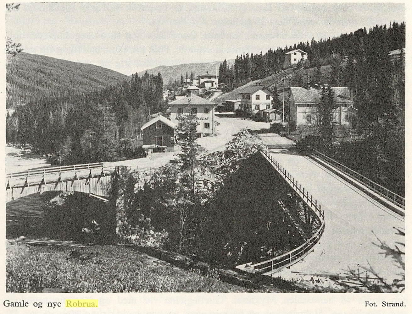 Robrua: Den første Robrua(L) vart bygd i 1821-22 av trematerialar, og kosta vel 350 spdlr. Den vart plassert like ovanfor dammen der Rosaga ligg. Me kan enno sjå noko av gamlevegen ned til brua på båe sider, og båe brustøa, og ser at brua har lege lågt over elva. Ho vart nok teken av flaumane mange gonger, siste gongen av storflaumen i 1860, men vart bygd opp att i 1861. Då ny gjennomgangsveg til Hemsedal, Sogn vart bygd ferdig i 1875. og vegen til Hemsedal ved Robru vart ombygd i 1878, auka trafikken. Då bygde vegvesenet ny bru ovanfor hølen, og vart ei tre- spennbru med mura brukar(B)(B)(B), Og slik kom ho høgt over elva. Den tredje Robrua vart bygd 1954. Det var ei elegante stålbru som vart lagd endå litt lenger opp(B)(B). Hallingdølen skriv i juli 1954 "Arbeidet med den nye Robrua er godt i gang. Jernkonstruksjonane er på plass og støyping av betongdekket vil bli påbegynt første dagane i juli. Med tilførselvegar er brua kalkulert til omlag 400.000 kroner. Brua blir bygt for eit akseltrykk på opptil 10 tonn". 5.nov same år skriv avisa "Den nye Robrua i Gol er snart ferdig og vil bli opna for trafikk ein gong i november. Det står berre att støyping av rekkverk på nordsida av brua, og litt vegarbeid på den andre sida, men sjølve brua er ferdig".