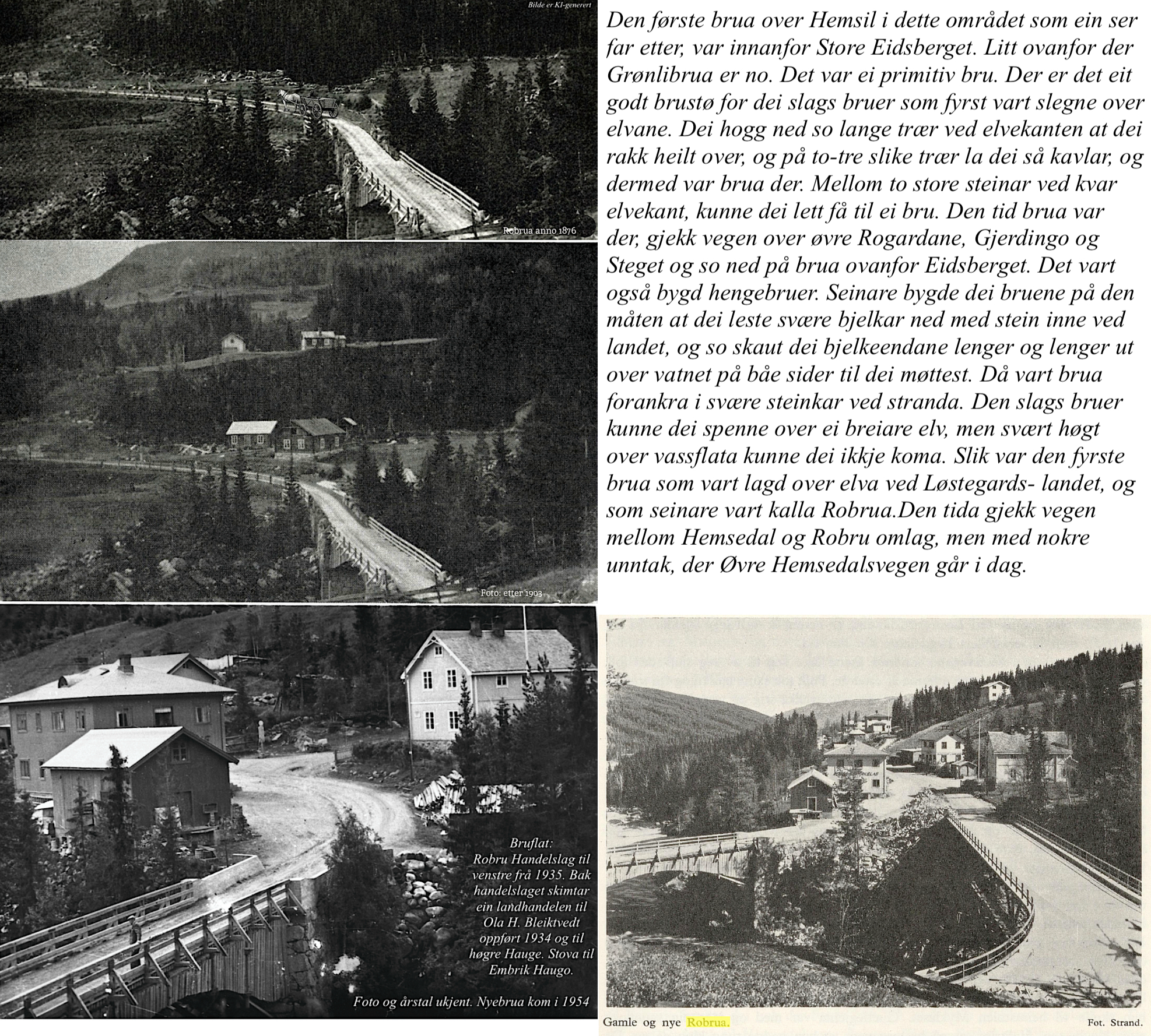 Kor kom ein seg over Hemsil i gamal tid ved Robru- traktene? Den første brua over Hemsil i dette området som ein ser far etter, var innanfor Store Eidsberget. Litt ovanfor der Grønlibrua er no. Det var ei primitiv bru. Der er det eit godt brustø(B) for dei slags bruer som fyrst vart slegne over elvane. Dei hogg ned so lange trær ved elvekanten at dei rakk heilt over, og på to-tre slike trær la dei så kavlar, og dermed var brua der. Mellom to store steinar ved kvar elvekant, kunne dei lett få til ei bru. Den tid brua var der, gjekk vegen over øvre Rogardane, Gjerdingo og Steget og so ned på brua ovanfor Eidsberget. Det vart også bygd hengebruer(B). Seinare bygde dei bruene på den måten at dei leste svære bjelkar ned med stein inne ved landet, og so skaut dei bjelkeendane lenger og lenger ut over vatnet på båe sider til dei møttest. Då vart brua forankra i svære steinkar ved stranda. Den slags bruer kunne dei spenne over ei breiare elv, men svært høgt over vassflata kunne dei ikkje koma. Slik var den fyrste brua som vart lagd over elva ved Løstegards- landet, og som seinare vart kalla Robrua. Det var nok den brua som låg der som er nemnd i A. Bøyesen og Ivar Wiel sine nedteikningar om presten Hans Cort, som døydde i 1648. Ei gong han kom frå Hemsedal og ville ri over brua, hindra skyssguten han i det, fordi han meinte brua var i for skrøpeleg stand. Og då dei jaga hesten utpå brast brua. Den tida gjekk vegen mellom Hemsedal og Robru omlag, men med nokre unntak, der Øvre Hemsedalsvegen går i dag.