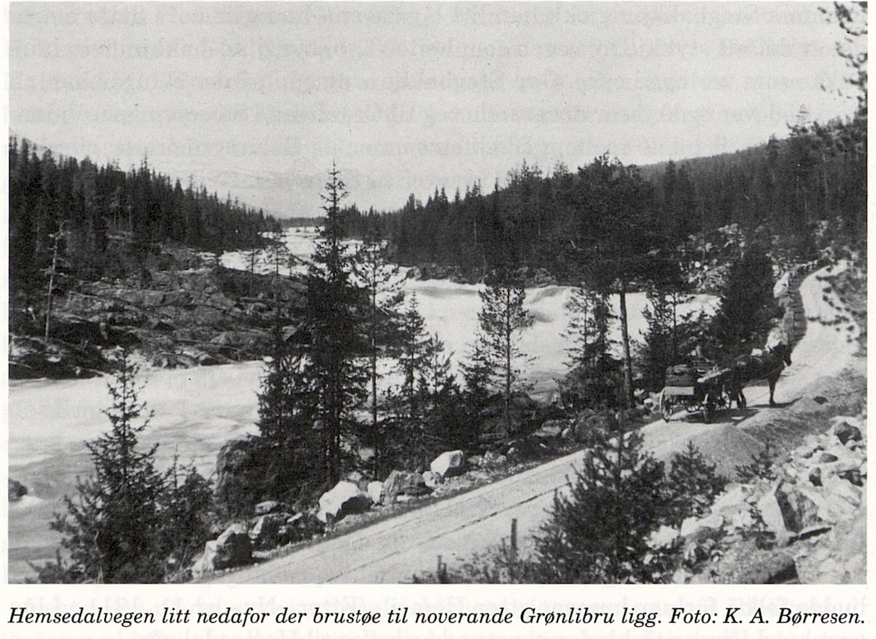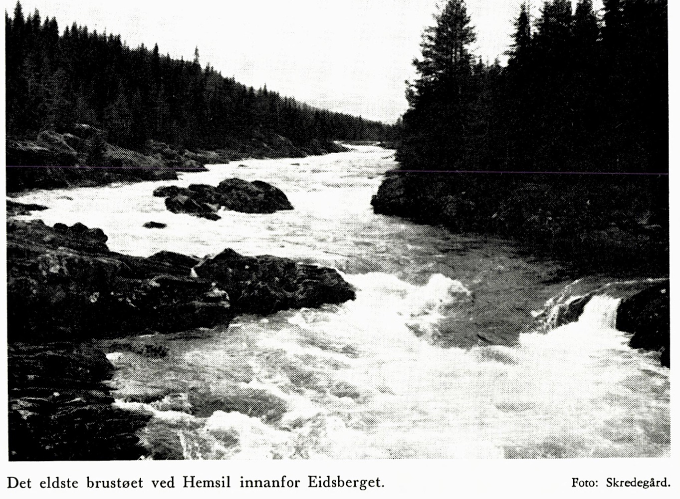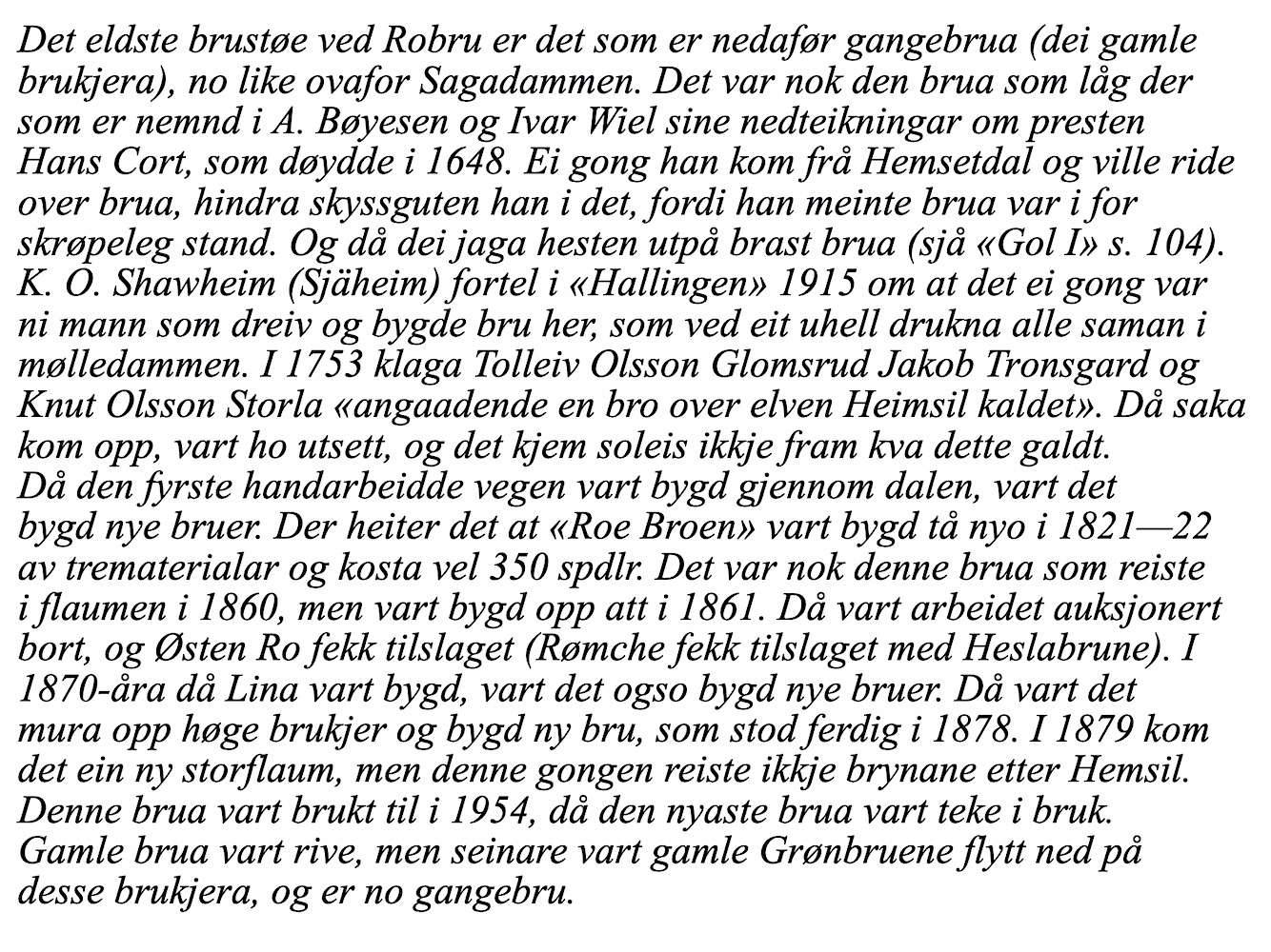 Kor kom ein seg over Hemsil i gamal tid ved Robru- traktene? Den første brua over Hemsil i dette området som ein ser far etter, var innanfor Store Eidsberget. Litt ovanfor der Grønlibrua er no. Det var ei primitiv bru. Der er det eit godt brustø(B) for dei slags bruer som fyrst vart slegne over elvane. Dei hogg ned so lange trær ved elvekanten at dei rakk heilt over, og på to-tre slike trær la dei så kavlar, og dermed var brua der. Mellom to store steinar ved kvar elvekant, kunne dei lett få til ei bru. Den tid brua var der, gjekk vegen over øvre Rogardane, Gjerdingo og Steget og so ned på brua ovanfor Eidsberget. Det vart også bygd hengebruer(B). Seinare bygde dei bruene på den måten at dei leste svære bjelkar ned med stein inne ved landet, og so skaut dei bjelkeendane lenger og lenger ut over vatnet på båe sider til dei møttest. Då vart brua forankra i svære steinkar ved stranda. Den slags bruer kunne dei spenne over ei breiare elv, men svært høgt over vassflata kunne dei ikkje koma. Slik var den fyrste brua som vart lagd over elva ved Løstegards- landet, og som seinare vart kalla Robrua. Det var nok den brua som låg der som er nemnd i A. Bøyesen og Ivar Wiel sine nedteikningar om presten Hans Cort, som døydde i 1648. Ei gong han kom frå Hemsedal og ville ri over brua, hindra skyssguten han i det, fordi han meinte brua var i for skrøpeleg stand. Og då dei jaga hesten utpå brast brua. Den tida gjekk vegen mellom Hemsedal og Robru omlag, men med nokre unntak, der Øvre Hemsedalsvegen går i dag. Her bilder frå gamlevegen(B)(B).