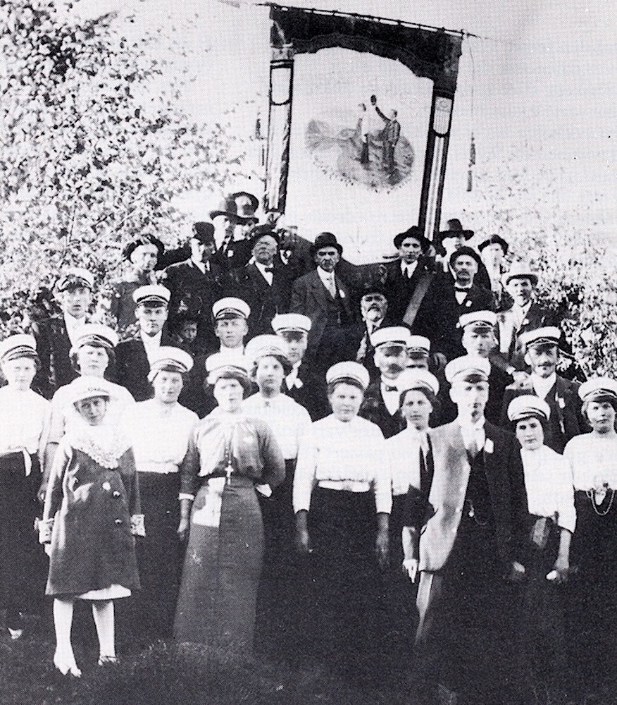 2. rekke frå venstre: Herman Hulen, Erik E. Øynebråten, Peder P. Rustberggard, Ola Jonsgard, Mekkel P. Rustberggard, Sander Jonsgard, Asle Roteigen og Arnfinn P. Rustberggard.