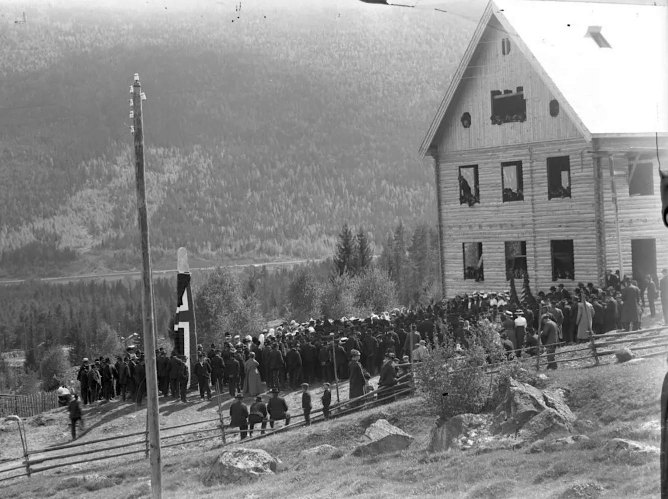 Det største møtet mellom folk av hallingætt i Amerika og Hallingdal var i jubileumsåret 1914. Over 1200 norskamerikanerar reiste til Noreg og såg att gamle tufter og trefte skyldfolk. Den store ferda kom til Hallingdal i slutten av mai 1914. Det var mange møte og festlege samvær i alle kommunar, med program og mat på gammal gjerd.Gjestene hadde også med seg pengegåver som vart gjevne som legat. Men hallingane ytte ei motgåve til det slektningane i Amerika gav. Erling Bekkestad og Svein Nestegard sette seg i sving og fekk laga ei fane, som målaren Ekornes måla. Denne vart overlevert på ei stor samstemne på Nesbyen.I Gol song Rotneim songkor for gjestene, med lærar O. T. Brennhovd som dirigent. Brennhovd var aktiv i ungdomsarbeidet i Gol, han var med og skipa Hallingdal sogelag og Hallingdål songarsamskipnad og han var organist. Det vekte nok sikkert mange minne, då dei langvegsfarande gjestene fekk høyre att kjære songar og salmar.På biletet ser me Rotneim songkor med Hallingfana. Dei som står mellom songkoret og fana er av dei norskamerikanske gjestene.
