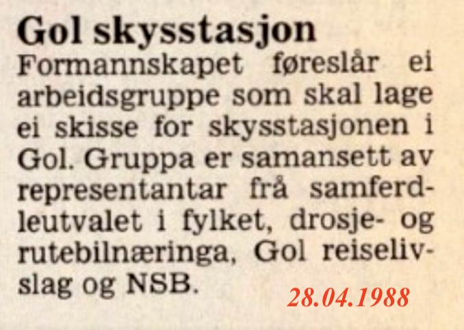 GOL SKYSSTASJON OPNA JUNI 1991 Gol skysstasjon vart offisielt opna 18. juni 1991(B). Buskerud fylkeskommune teikna aksjar for 500 000 kr. I bygget er det sett av arial til venterom med offentleg toalett, kioskdrift og rom for utleige, noko som skal gje inntekt til bygget. April 1988 valgte formannskapet i Gol kommune ei arbeidsgruppe som skulle laga ei skisse for skysstasjonen(B). På tomta(B) til skysstasjonen stod bl.a Faraasen Trevarefabrikk og bustadtomta Solvang. I 1984 vart desse eigene teke over av Gol kommune, som reiv bustadhuset og trevarefabrikken og tok tomta i bruk til busshaldeplass(B).