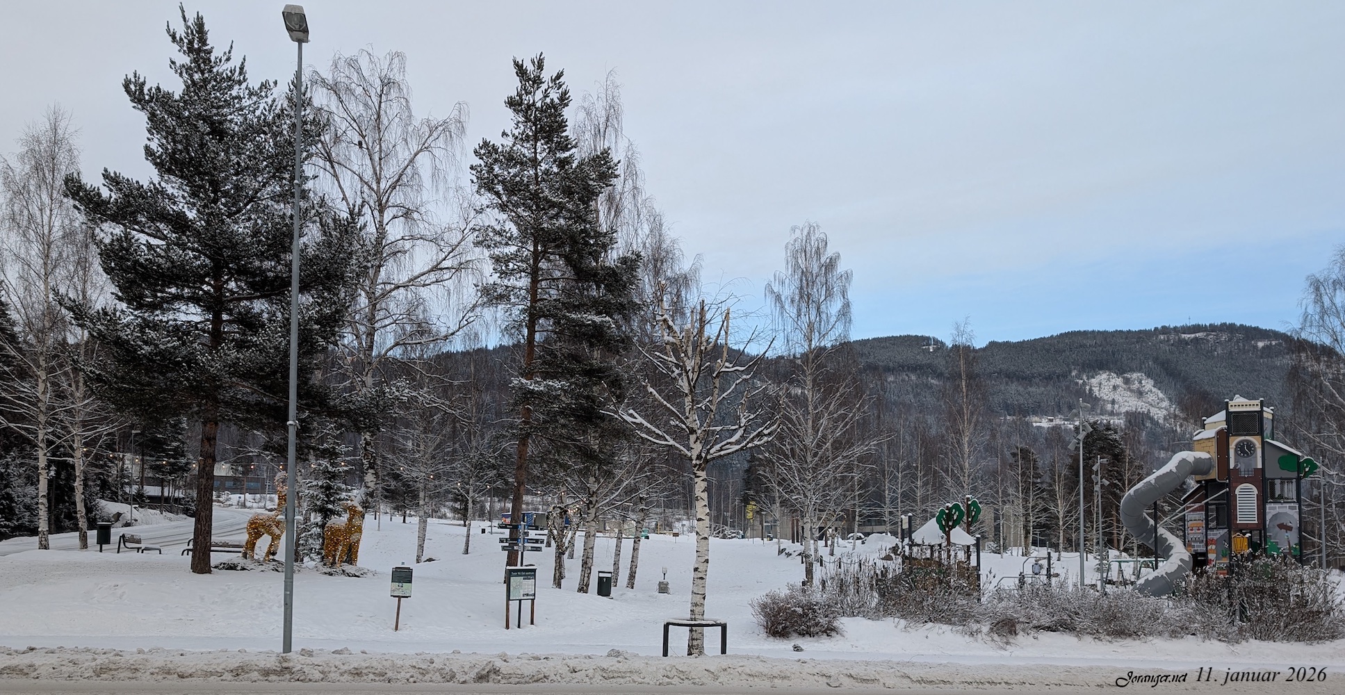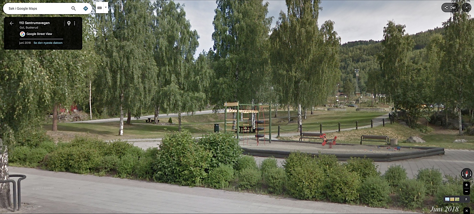 Med det "Nye" Gol sentrum i 1993 fekk sentrum ei ansiktsløft, bl.a vart det bygd eit parkområde ved sida av Skysstasjonen. Tomta er gjenbruk(L)(B). For å få til dette måtte kommunen opp i Golreppen å kjøpe grunn til den nye Svøovegen. Vegen opp til skuleanlegget gjekk tidlegare der parkområdet ligg(B). Du kan sjå den gamle Svøovegen her(B). Juni 2018 såg det slik ut(B). Når ein skriv august 2024 ser ein at leikeområdet blir fornya(B)(B)(B).