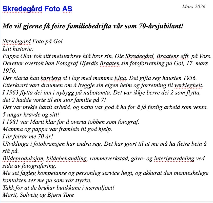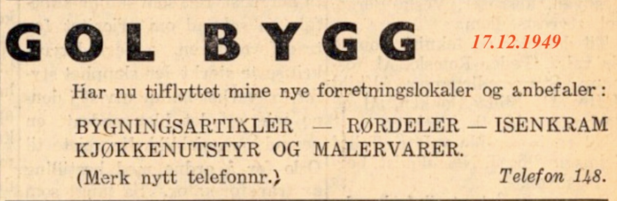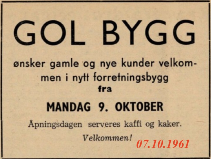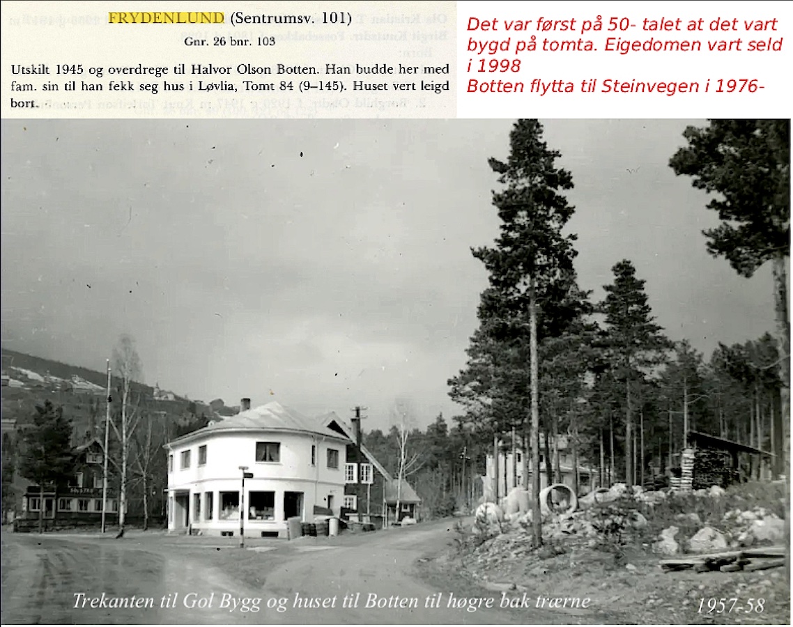 SENTRUMSVEGEN 104, 25/146 BØYUM vart bygd i 1962. Olav Skredegård kom til Gol i 1956 og byrja som fotograf. I 1960 kjøpte han tomt og bygde si eiga forretning i 1962. De første som leigde lokaler hjå Skredegård var Li og Vult Simon i 1963. Bottolfsletten leigde der ei tid før han flytta inn i nybygg i 1971. 2026 feira dei 70- årsjubileum.