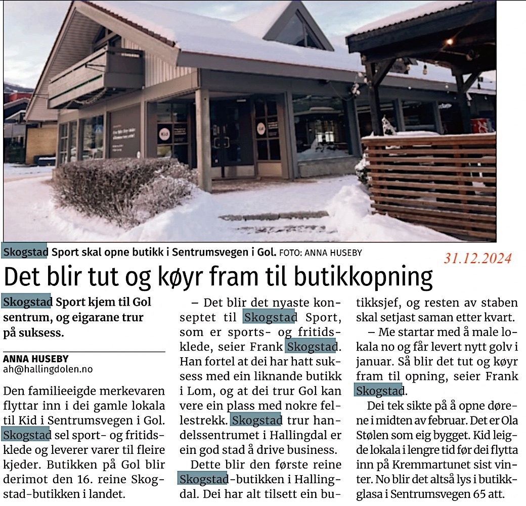 EIDSGAARD MATSENTER FLYTTA INN I NYBYGG 1980 18. juli 1880 var det opning av det nye forretningsbygget til E. B. Eidsgaard, Eidsgaard Matsenter(B). For å unngå å stoppa handelen vart varene ført over frå det gamle til det nye bygget før gamlebutikken vart riven(B) fredag den 11. juli. Samstundes som det nye forretningsbygget er blitt eit markant trekk i gatebildet i øvre Gol, har eit anna forsvunne. Etter mange gode år vart Eidsgaard matsenter avvikla i 1989. Same året flytta Aka inn i bygget. Der vart dei til november 1994. Dei vart avløyst av Rimi som flytta inn i 1995. 18.06.2013 flytta posten hit til ICA matsenter. Coop kjøpte alle butikkane til ICA i oktober 2014 og dreiv sjølv Matkroken kalenderåret 2015. 31. januar 2016 vart også denne butikken avvikla og posten flytta til LK- senteret. Intersport si fjellkjede Outlet, flytter inn i lokala 8.mars same år. Dei tømmer lageret i 2018. Intersport opna i 2020 ny butikk lenger ned i gata.