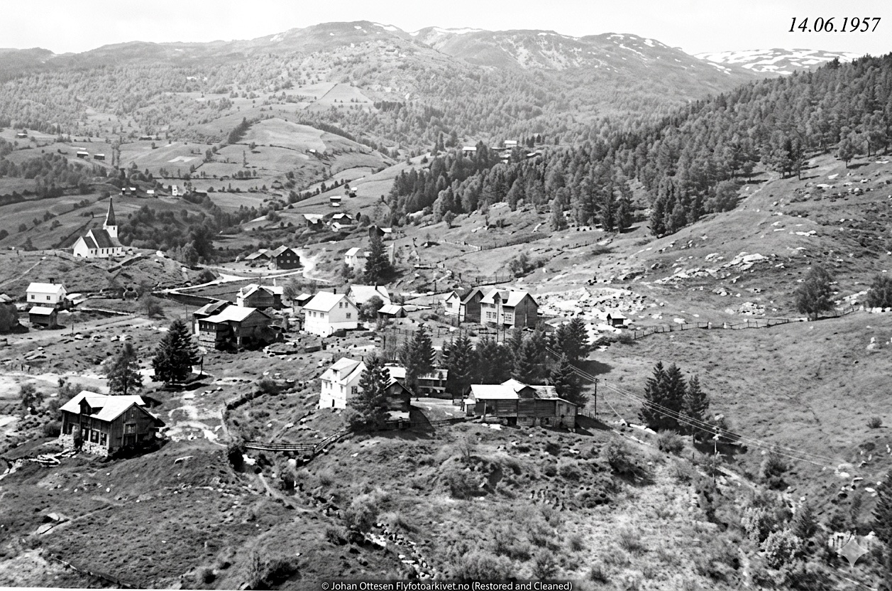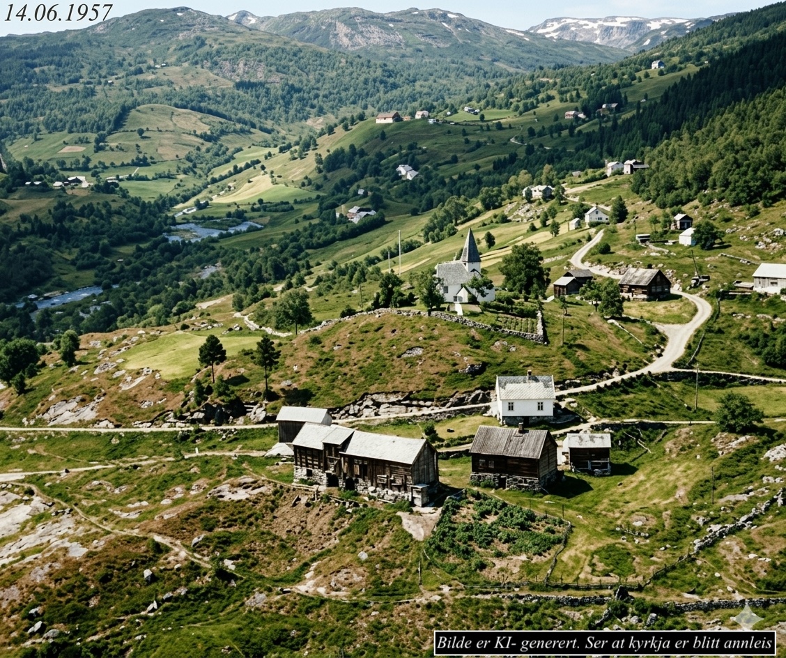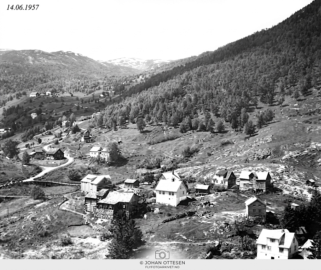 "Storevegen (Rv55) vart brøytt med treplog og to hestar framfor. 1928 var første året vegen vart brøytt med bil.